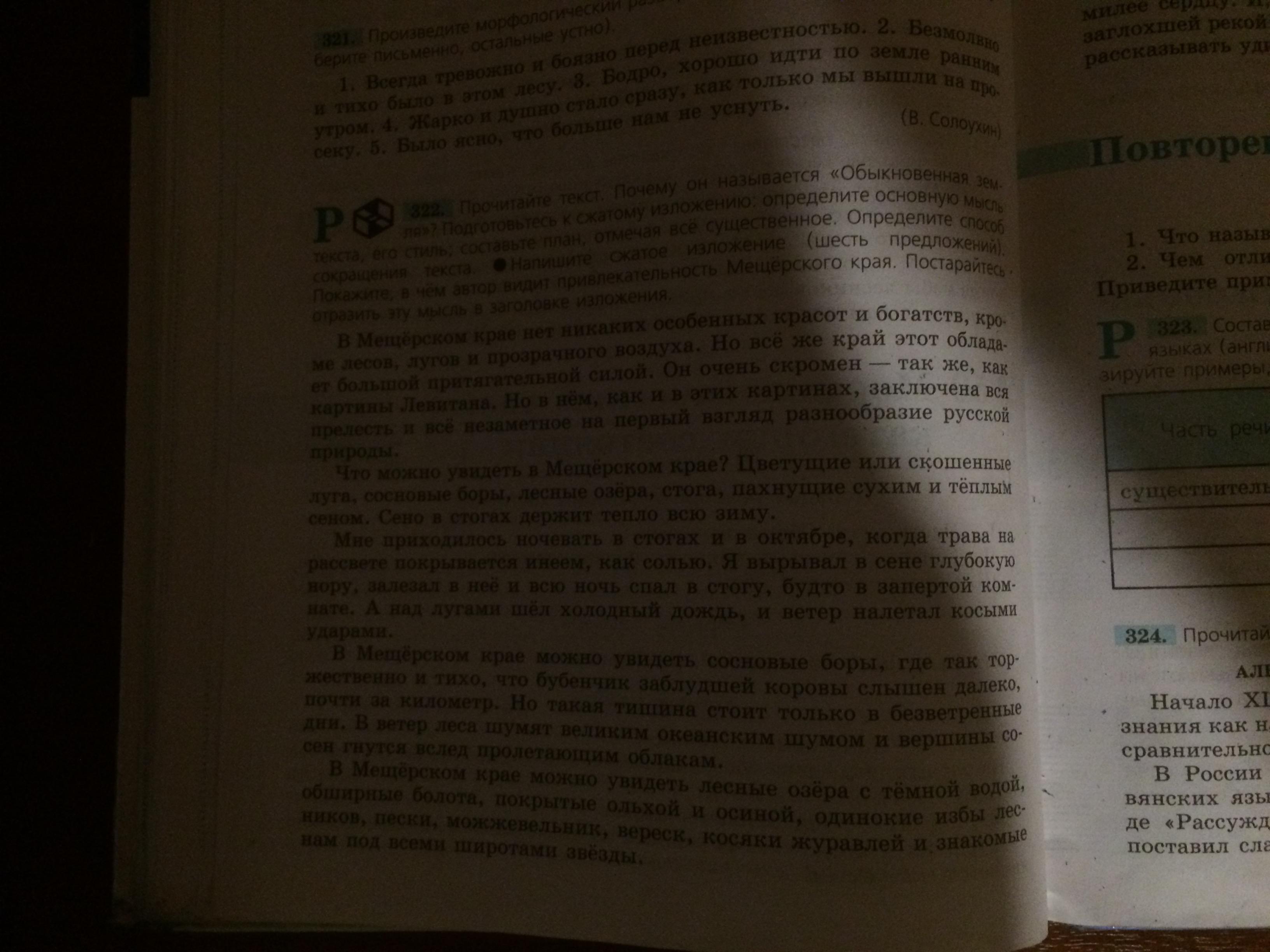 Мещёрский край скуден на красоты и богатства, кроме лесов, лугов и воздуха. Цветущие или скошенные луга, сосновые боры, лесные озера, стога, пахнувшие сеном. Мне пришлось выживать в стогах, вырывая глубокую нору и спал в ней. В Мещёрском крае можно найти тихие сосновые боры в безветренное время. Там же можно увидеть красивые озера с темной водой, болота, покрытые ольхой и осиной, одинокие избы лесников и другие богатства этого места. Здесь можно услышать звуки животных и птиц. Со временем этот край становится все приятнее для души, каждая ива становится для тебя знакомой.