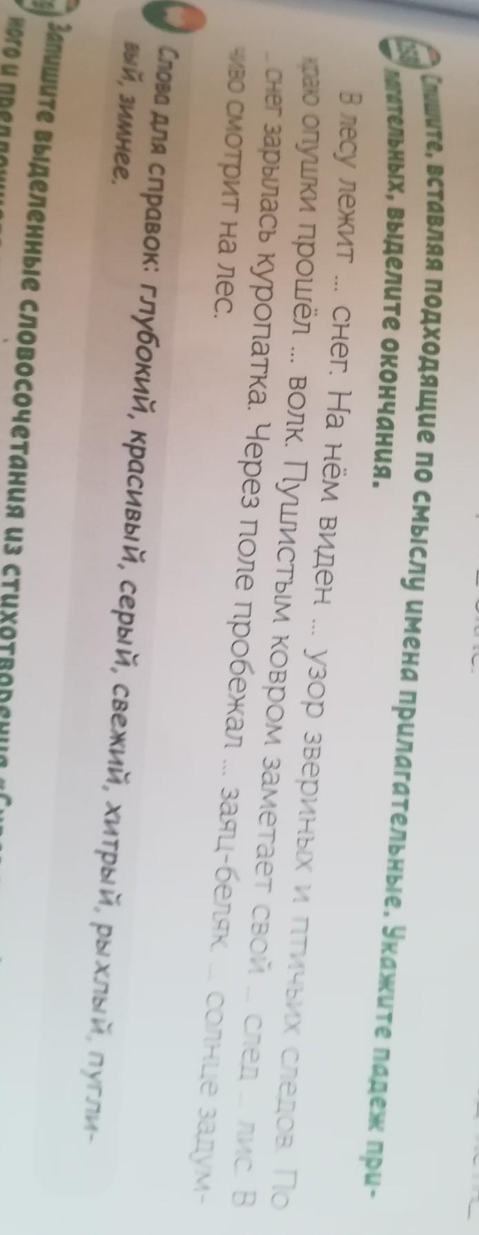 В лесу лежит рыхлый снег. На нём виден красивый узор звериных и птичьих следов. По краю опушки прошёл серый волк. Пушистым ковром заметает свой свежий след хитрый лис. В глубокий снег зарылась куропатка. Через поле пробежал пугливый заяц-беляк. Зимнее солнце задумчиво смотрит на лес.