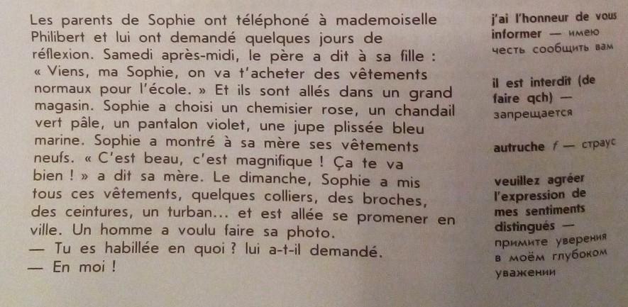 Родители Софии позвонили мадемуазель Филибер и просили ее несколько дней подумать. В субботу, после полудня, отец сказал дочери: "Пойдем, моя София, мы купим тебе нормальную одежду для школы". И они пошли в большой магазин. Софи выбрала розовую рубашку, свитер бледно зеленого цвета, фиолетовые брюки, плесерованную юбку морского цвета. Софи показала свои новые вещи маме. "Это красиво! Это волшебно! Это тебе подойдет!" Сказала мама. На следующий день, Софи надела все свои новые вещи, несколько бус, броши, пояса и чалму, и пошла гулять по городу. Один мужчина хотел сделать фото.
