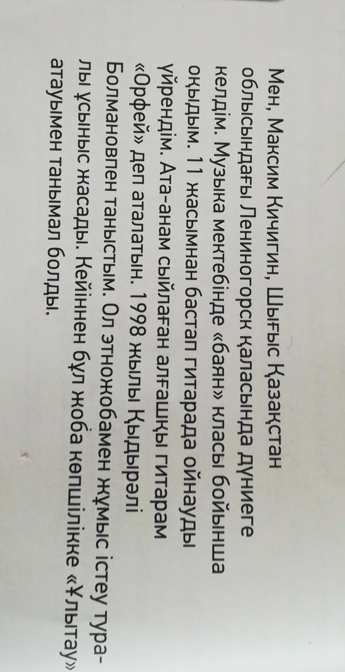 Я, Максим Кичигин, родился в Восточно-Казахстанской области, в городе Лениногорск. Учился в Музыкальной школе по классу баян . С одиннадцати лет научился играть на гитаре. Первая моя гитара называется "Орфей", мне подарили родители. В тысяча девятьсот девяносто восьмом году познакомился Кыдырали Болмановом. Он предлагал работать над этнопроектом . Потом это проект был знаком обществу под названием "Ұлытау".