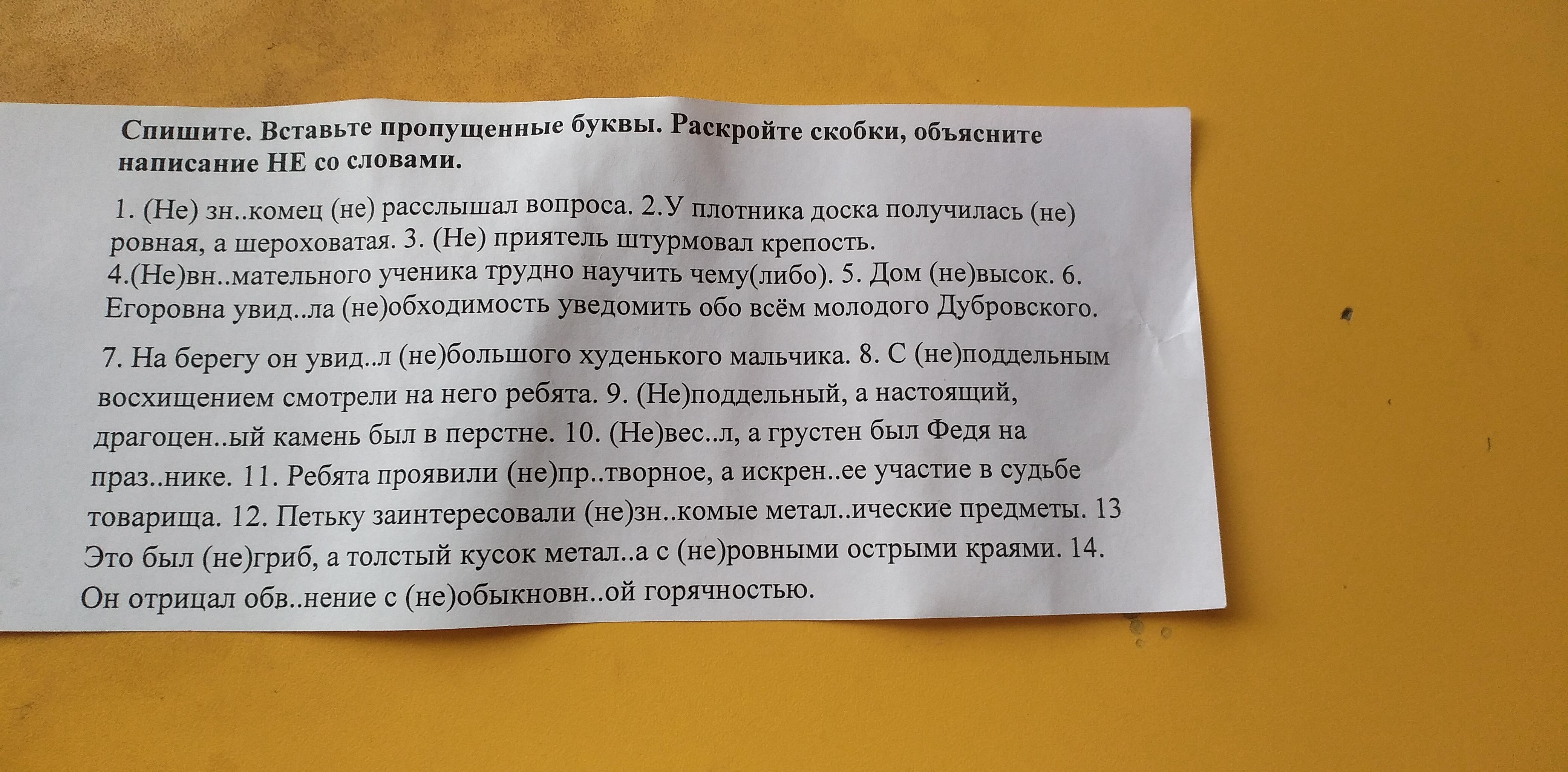 7. На берегу он увидел не большого худенького мальчика. 8. С не поддельным восхищением смотрели на него ребята. 9. Не поддельный, а настоящий, драгоценный камень был в перстне. 10. Не весел, а грустен был Федя на празднике. 11. Ребята проявили непритворное, а искреннее участиев судьбе товарища. 12. Петьку заинтересовали незнакомые металлические предметы. 13. Это был не гриб, а толстый кусок металла с не ровными острыми краями. 14. Он отрицал обвинение необыкновенной горячностью.