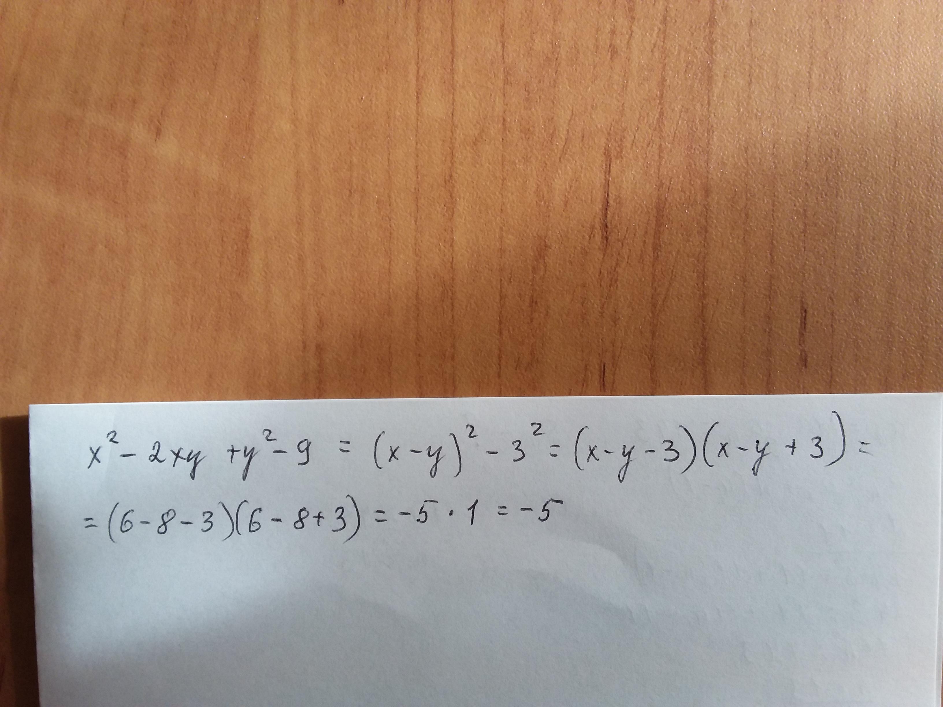 Розкладіть на множники многочлен x 2 − 2 x y + y 2 − 9 і знайдіть його значення при x = 6 , y = 8 . срочно