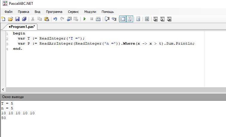 var P := ReadArrInteger(ReadInteger('n =')).Where(x -> x > t).Sum.Println;