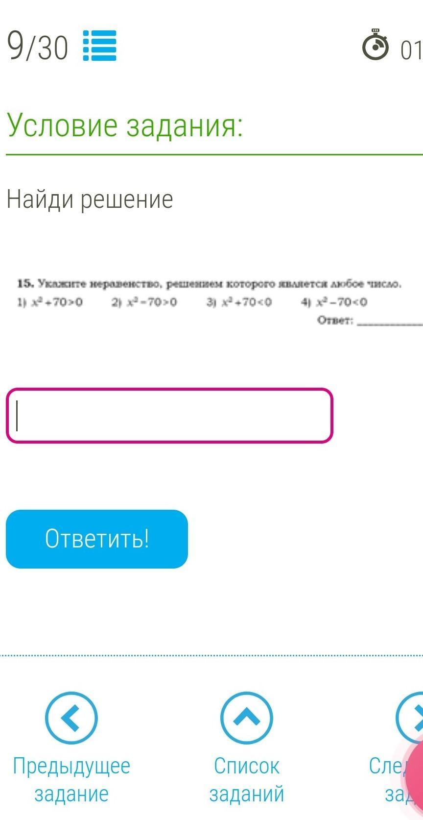 Решением неравенства x² + 70 > 0 является любое число, т.к. любое число в квадрате ≥0 и, прибавив к нему 70, мы всегда будем получать положительное число
