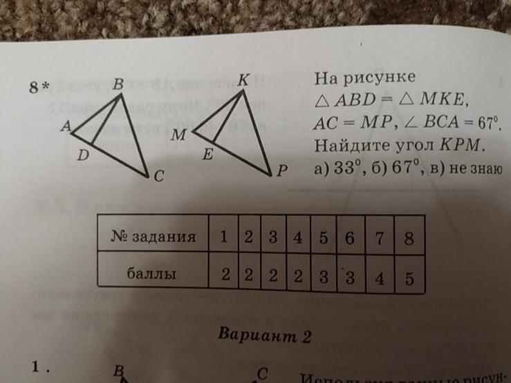 АВ=МК и АС=МР по условию) ⇒∠КРМ=∠ВСА=67°. Ответ: б)