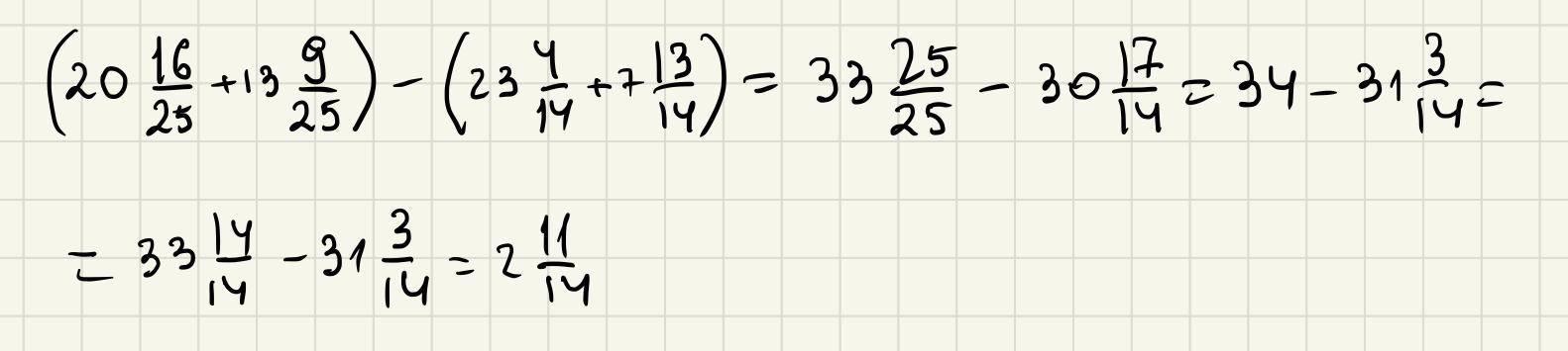 ((20+30)+(16/25+9/25))-(23+7)+(4/14+13/14)
