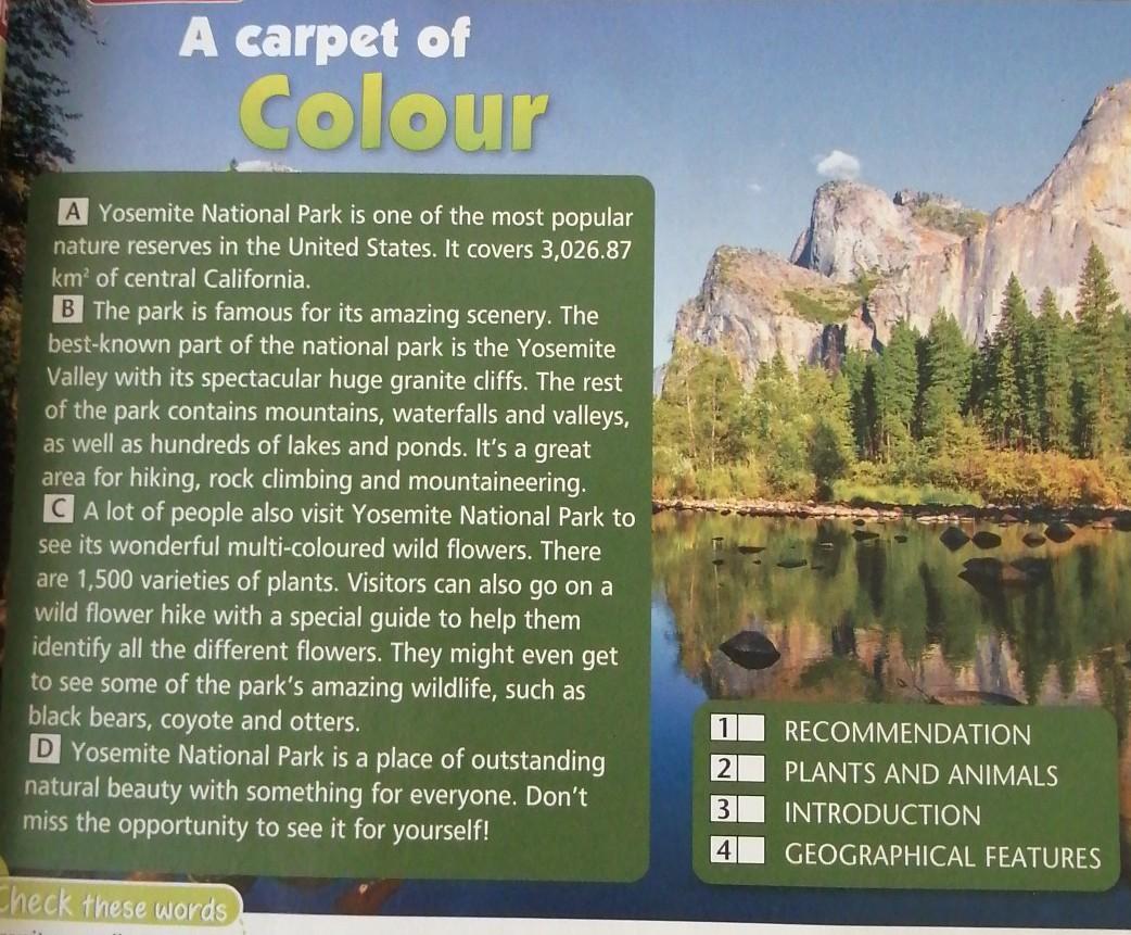 A lot of people also visit Yosemite National Park to see its wonderful multi-coloured wild flowers. There are 1,500 varieties of plants. Visitors can also go on a wild flower hike with a special guide to help them identify all the different flowers. They might even get to see some of the park's amazing wildlife, such as black bears, coyote and otters.