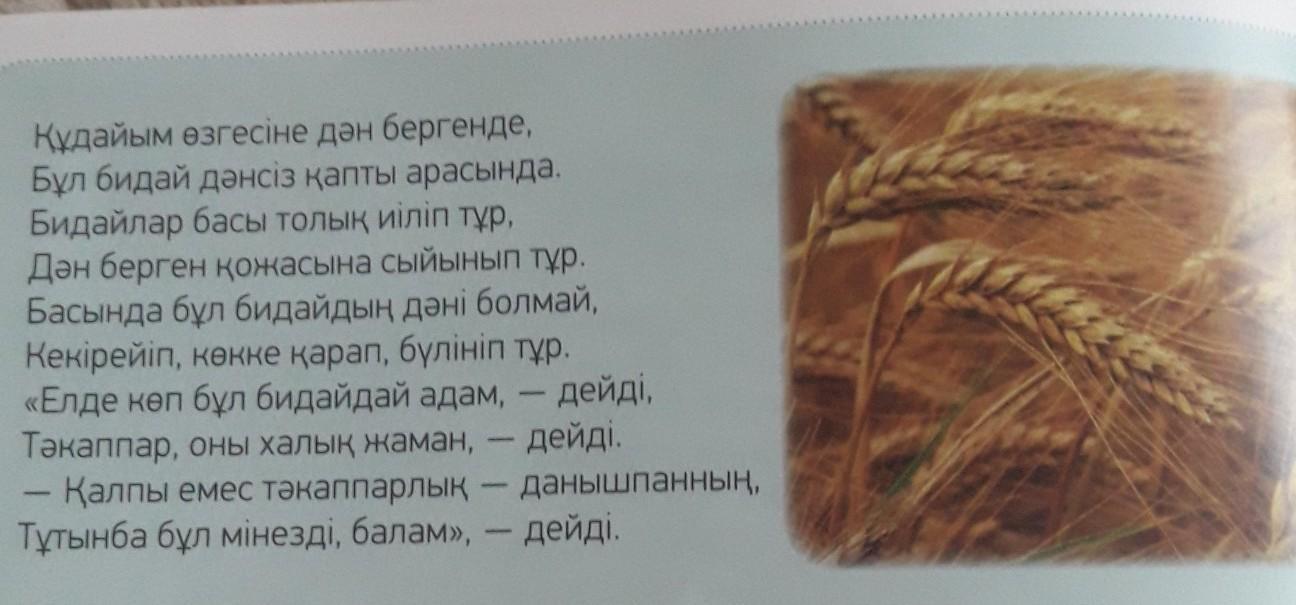 Егін алқабында барлық бидайдың дәні болады да, бір бидай дәнсіз болады, бұл оған түк қиналмай өзін өзге бидайлардан артық көріп, тәкәппарланып, басын биік ұстап тұрады. Елде бұл тәкәппар бидай адам көп, бірақ такәппарлық жақсы мінез емес, сондықтан адам кішіпейіл болған дұрыс,- дейді өлеңде.