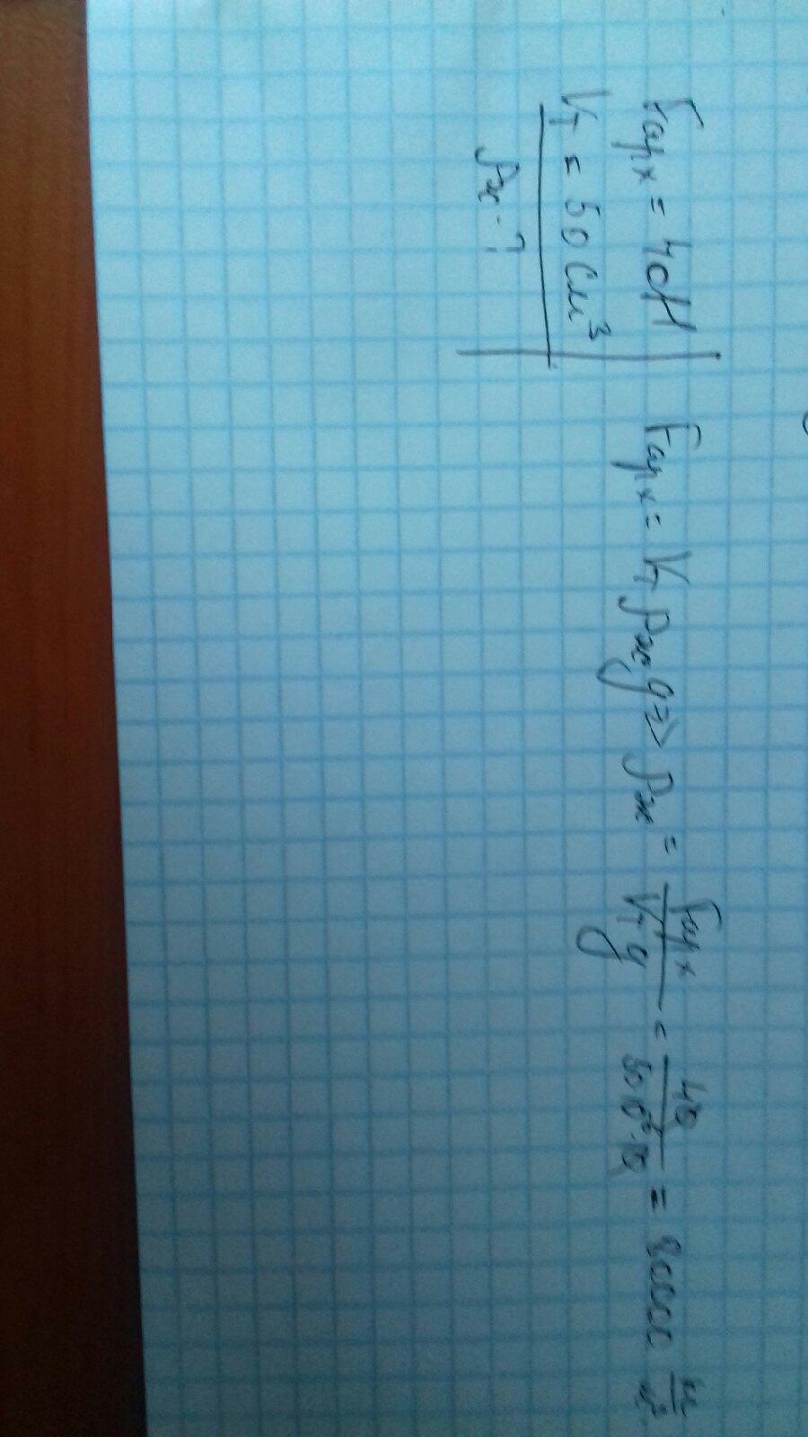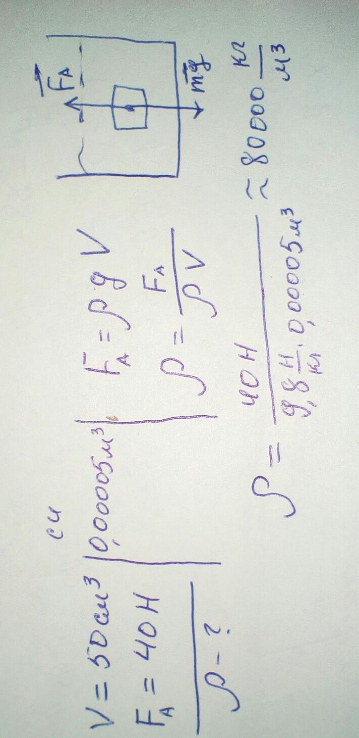 Определите плотность жидкости,если на тело объемом 50см3 действует выталкивающая сила 40H!