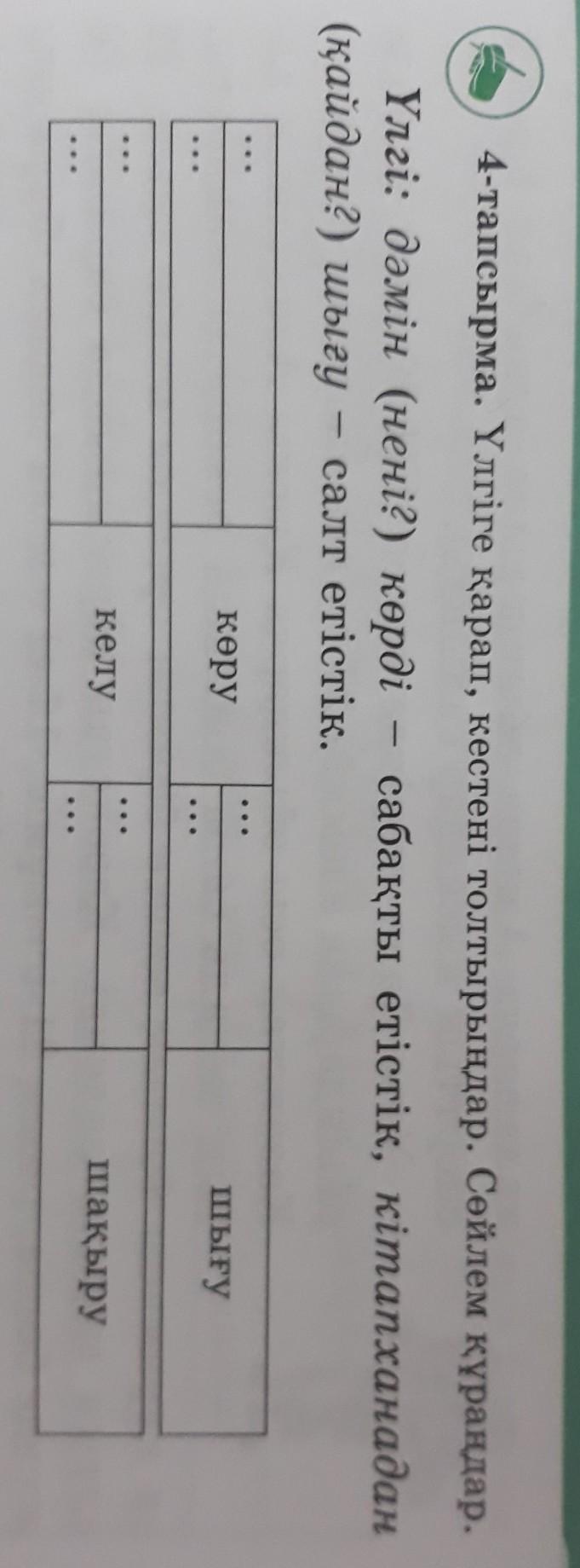 түрін көру (сабақты етістік), түсін көру (сабақты). Мектептен келу (салт), үйге күле (салт) . дәріханадан шығу (салт) , дәмханалар шығу (салт) . Үйге шақыру (салт) , досынды шақыру (сабақты)