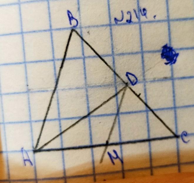 Задача: Прямая, проходящая через середину биссектрисы AD треугольника ABC и перпендикулярная к AD, пересекает сторону AC в точке М. Докажите , что МD||AB.