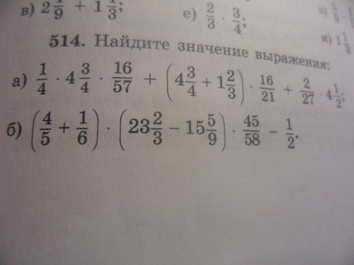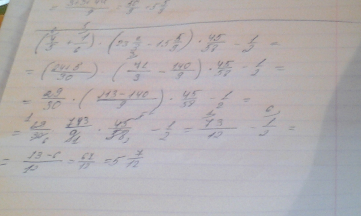 Итак, сначала приводим к общему знаменателю 30 в первых скобках(дополнительные множители 6 и 5). Переводим дроби в неправильные( кажется, они так называются) во второй скобке, всё остальное пока не трогаем. Вычисляем первую скобку, приводим к общему знаменателю 9 вторую, всё остальное пока отдыхает. Делаем вычитание и всё записываем уже без скобок. Делаем умножение(сокращаем 45 и 9, 58 и 29, 30 и 5(то что получилось после сокращения 45)) - одна вторая остаётся нетронутой. После сокращение получаем-с 73 двенадцатых - одну вторую. Приводим к общему знаменателю 12(дополнительные множители 1 и 6), вычитаем от 73 шесть, получаем 67 двенадцатых. А это если перевести в правильную дробь 5 целых 7 двенадцатых. Надеюсь, я не допустила ошибок)