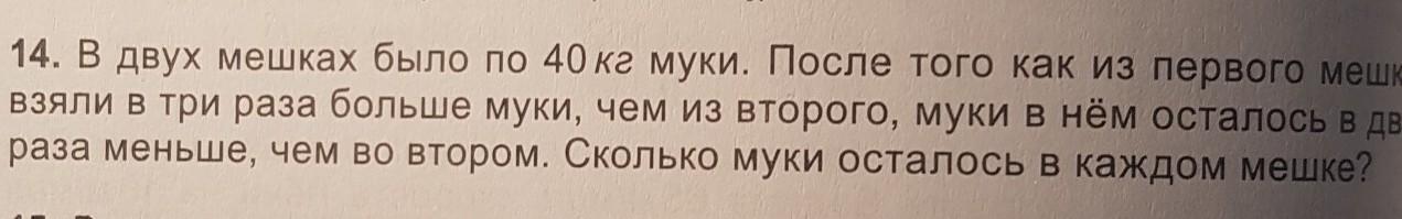 Допустим, из второго мешка взяли х кг муки, значит из первого (3х) кг муки, стало в первом (40-3х) кг, во втором (40-х) кг сахара.