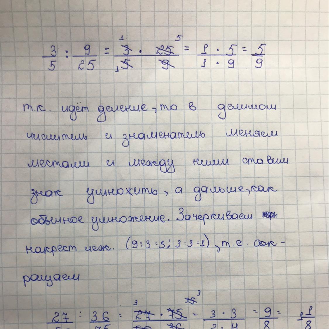 т.к идёт деление, то в делимом числитель и знаменатель меняем местами ,и вместо знака деления ставим умножить. Сокращаем накрест лежащие числа (9/3=3;3/3=1) (25/5=5(5/5=1)