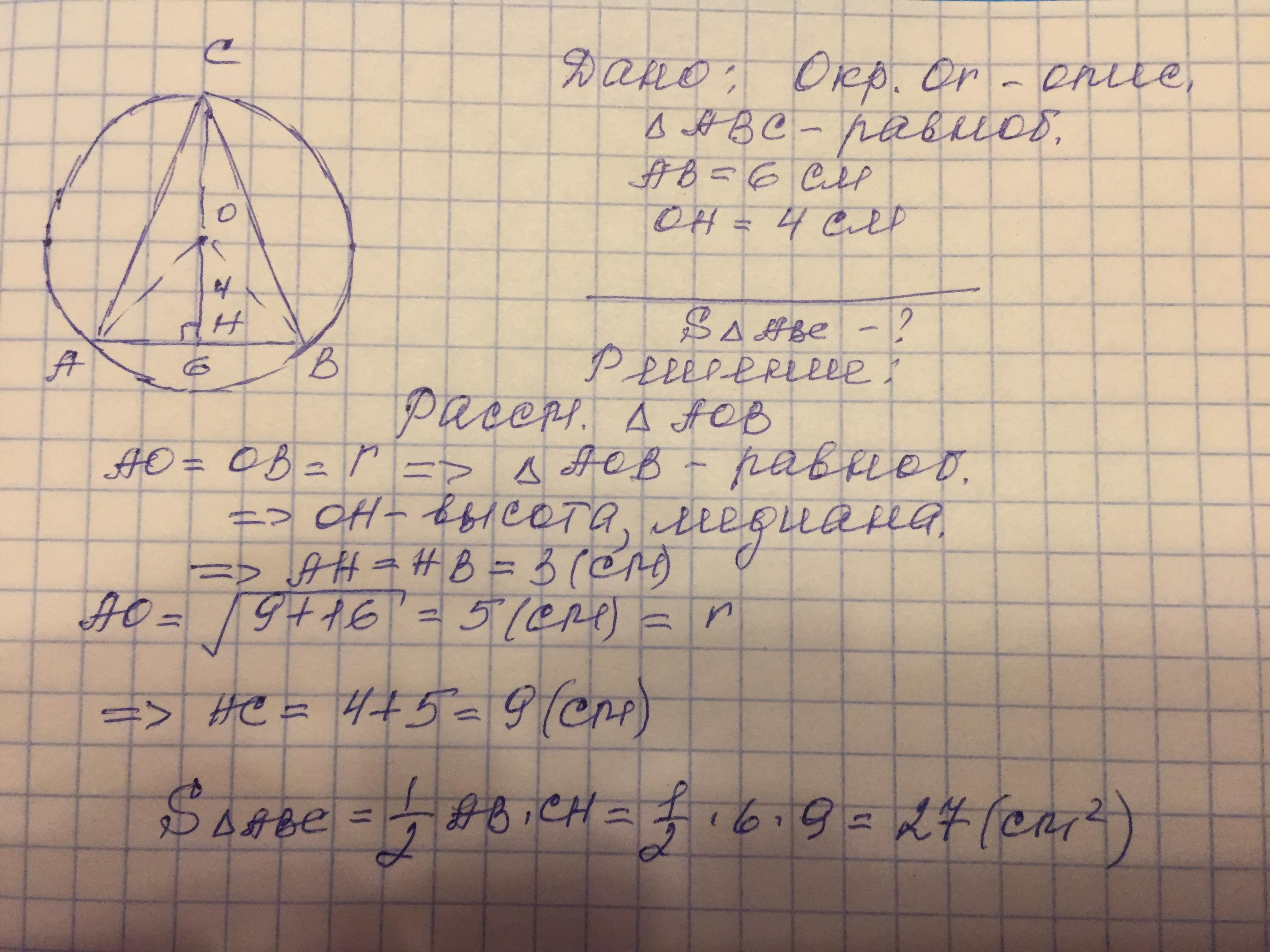 Найдите площадь равнобедренного треуголника с основанием ab=6,если расстояние от центра описанной окружности до ab=4