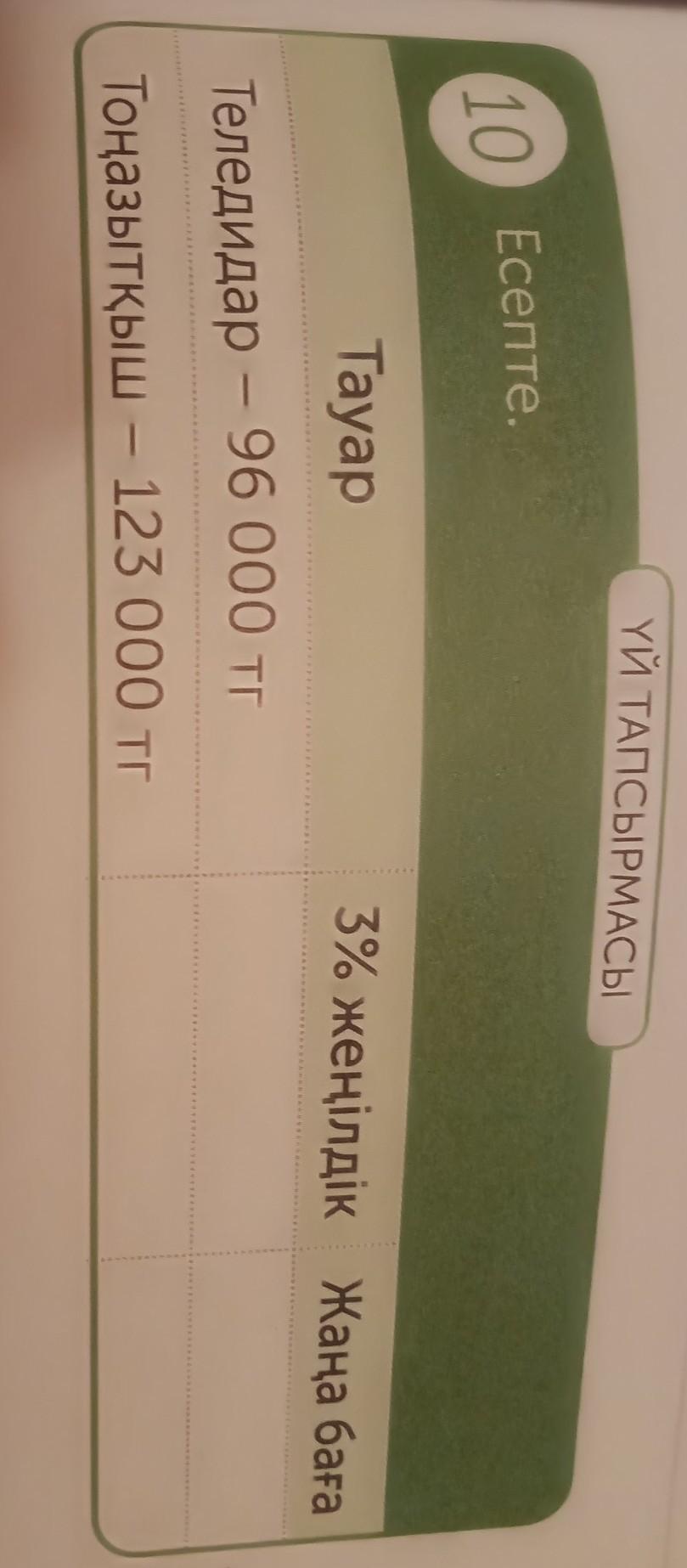 Пошаговое объяснение:96000 3%=2880жаңа баға 93120 123000 3%=3690жаңа баға 119310