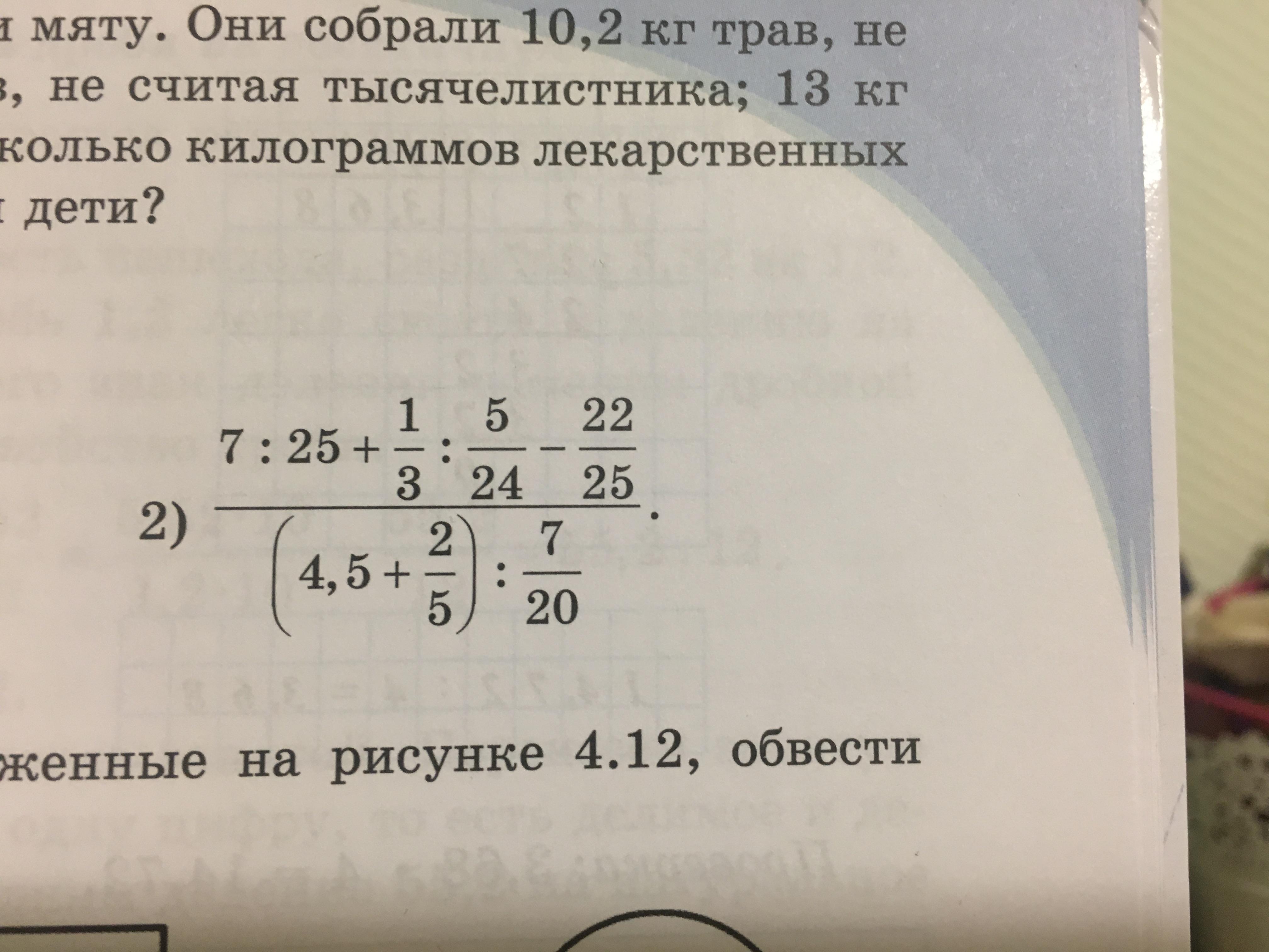 выполните действия: 7:25+1/3:5/24-22/25/(4,5+2/5):7/20