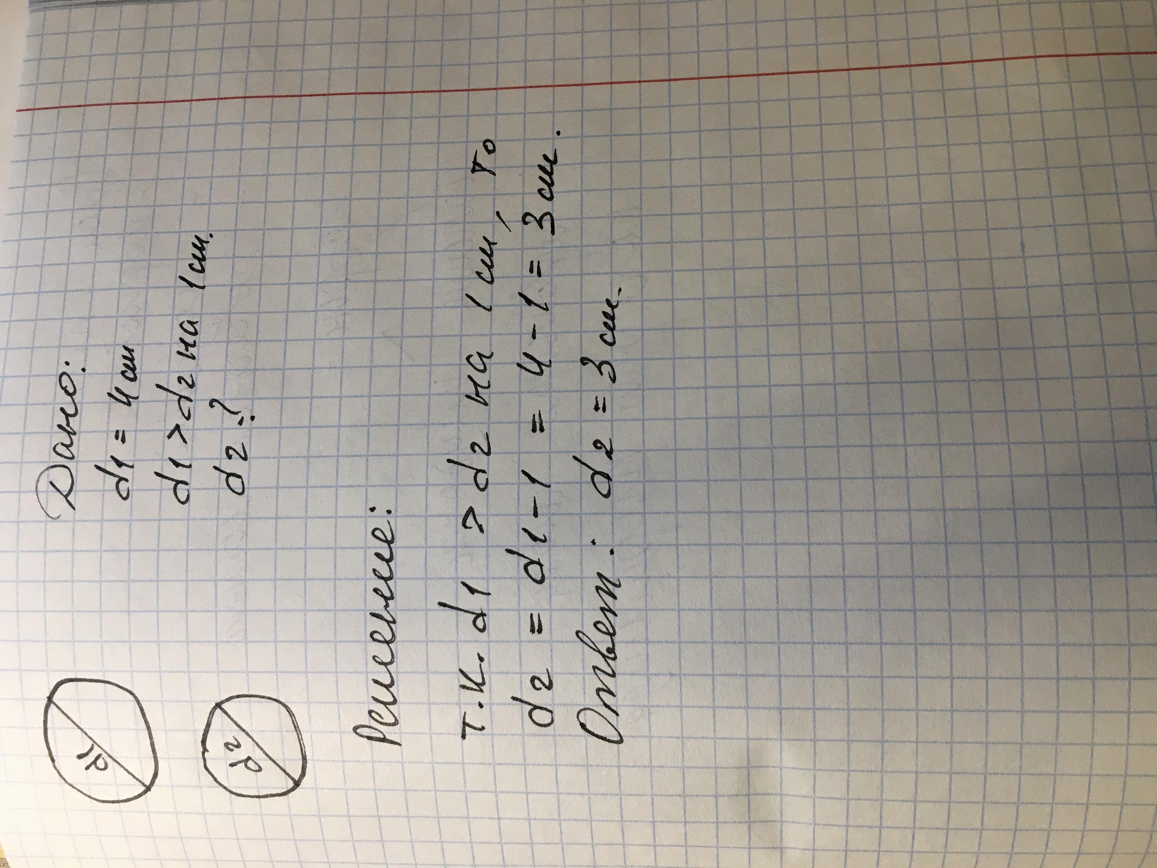 Диаметр первой окружности равен 4см. Он на 1см больше чем радиус второй окружности. Построй окружности вычислив их радиусы. Помогите написать краткое условие задачи и решение.