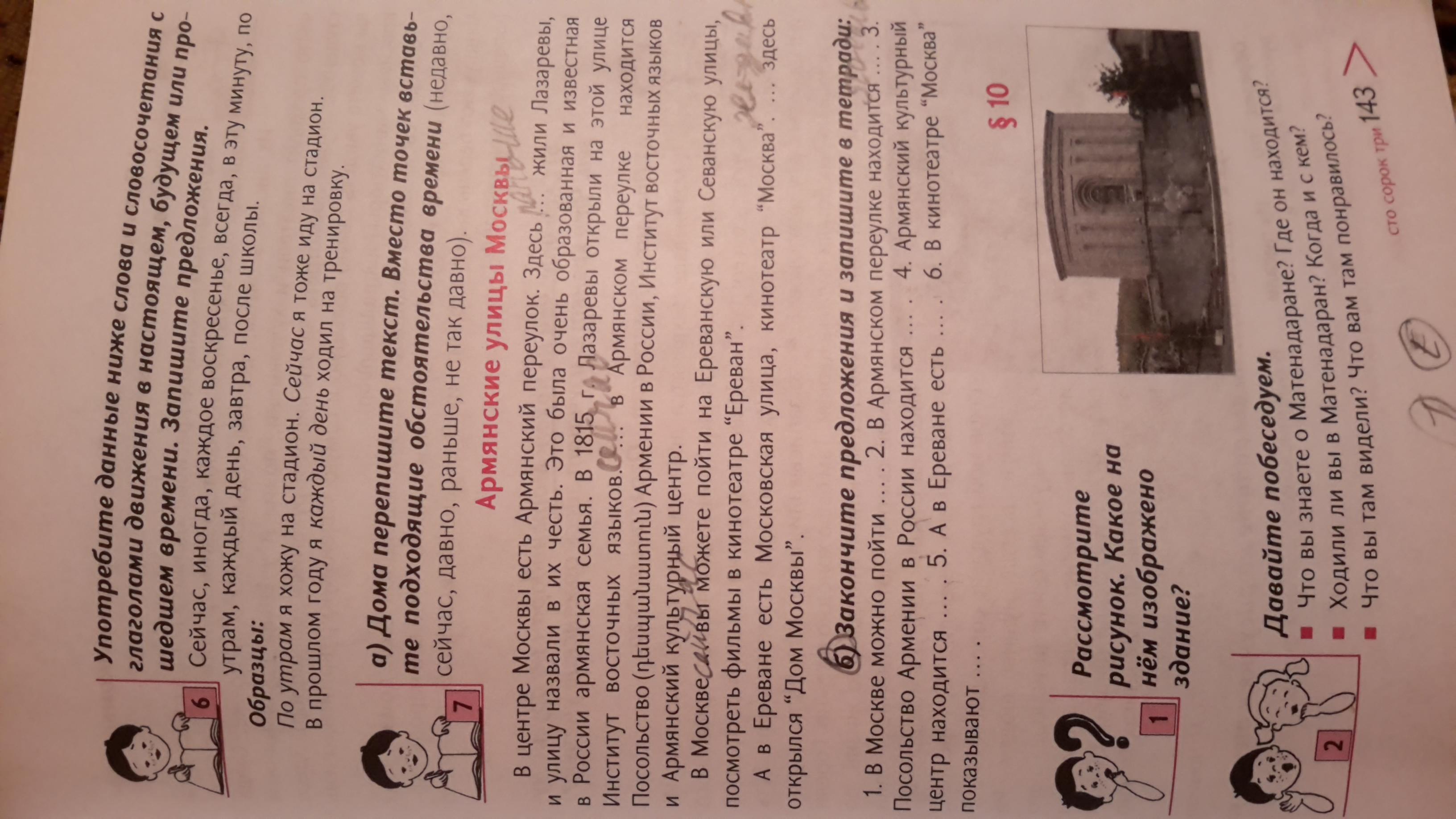 В Москве можно пойти на Армянский переулок. В Армянском переулке находится Посольство Армении, Институт восточных языков и Армянский культурный центр. Посольство Армении в России находится в Москве. Армянский культурный центр находится в Москве. А в Ереване есть Московская улица. В кинотеатре "Москва" показывают фильмы.