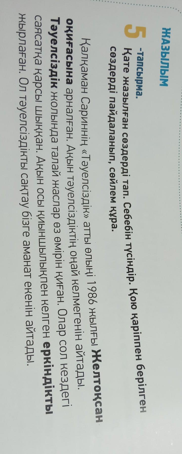 сөйлемдер: 1986 жыл[ы Желтоқсан оқиғасы Қазақстанның тәуелсіздік алуына өз септігін тигізді. Сонау қазақ хандығы ресей патшалығына қосылған кезден ақ тәуелсіздікті алуды аңсаған және соған әрекет еткен. Еркіндік қазақ халқының қанында бар нәрсе, қа зор ақ халқы бұрыннан еркіндік сүйгіш халық болып келген.