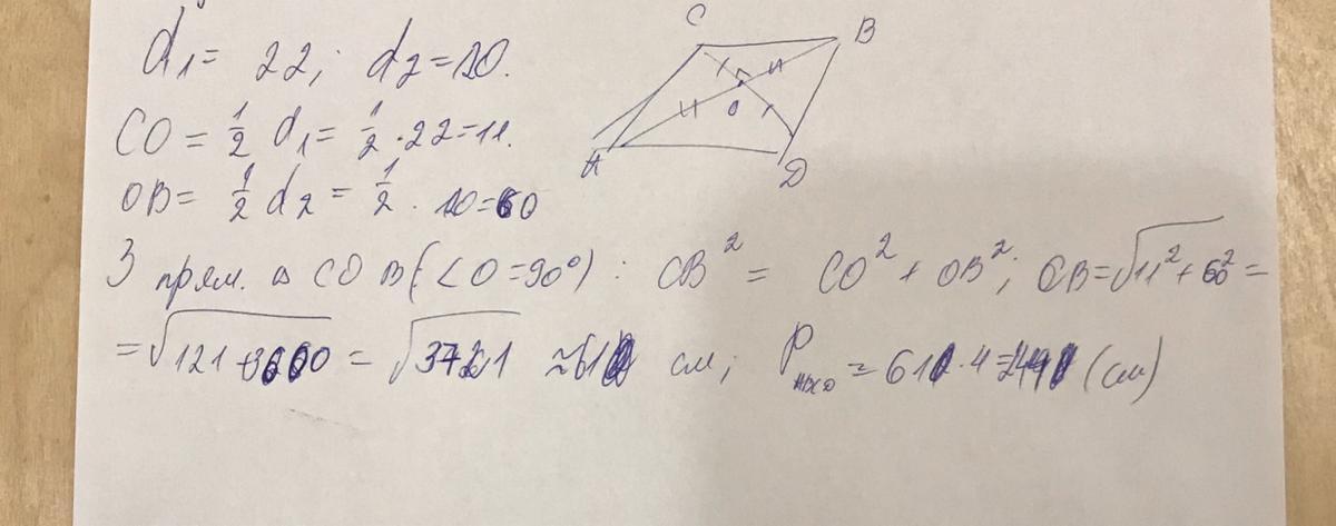 Пошаговое объяснение: диагонали ромба пересекаются под прямым углом (90 градусов) и точка пересечения делит диагонали пополам. Значит 22:2=11 см - половина меньшей диагонали. 120:2=60 см - половина большей диагонали. Итого мы получили прямой угол (90 градусов). Для того чтобы найти третью сторону, в нашем случае - это гипотенуза, мы воспользуемся теоремой Пифагора (BC^2=AB^2+AC^2).