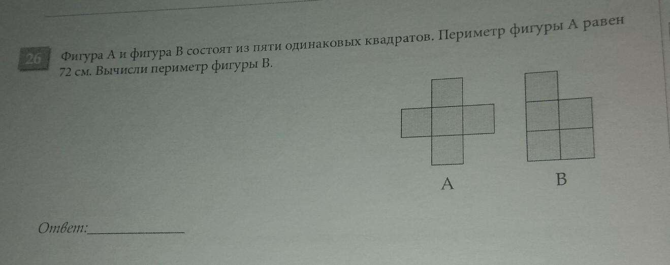 Периметр это сумма длин всех сторон. В фигуре "A" 12 "сторон", соответственно сумма этих 12 сторон равна 72. Чтобы узнать сторону квадрата, необходимо 72 (периметр) разделить на 12 (количество сторон):
