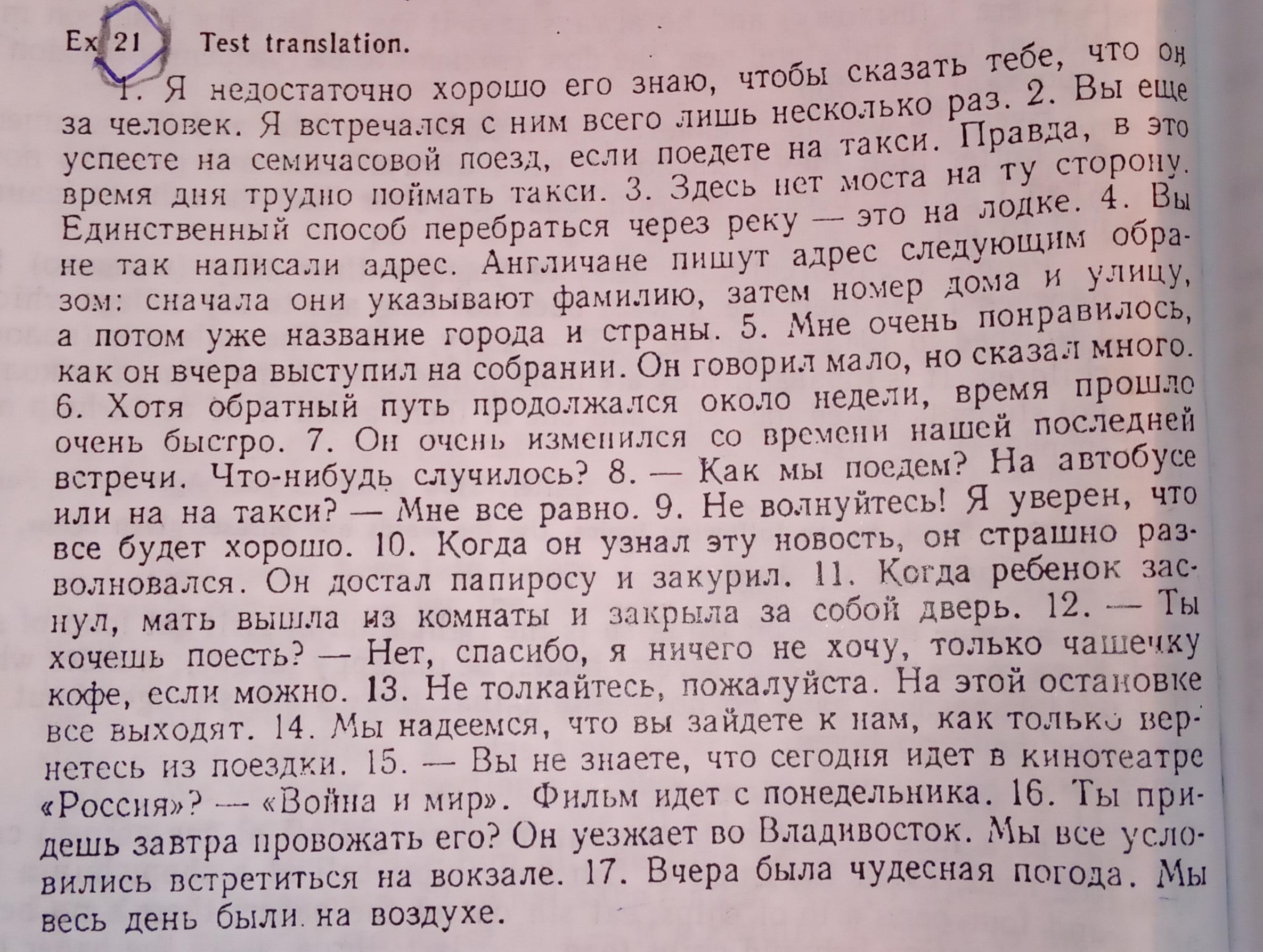 I don't know him well enough. to tell you what kind of person he is. I met him only a few times. 2. You’ll still be able to catch the seven-hour train if you go by taxi. True, at this time of the day it is difficult to catch a taxi. Z. Here ist of the bridge to that side. The only way to cross the river is to write the address wrong. The British write the address as follows: first they indicate the name, then the house number and street, and then the name of the city and country. 5. I really liked how he spoke at the meeting yesterday. He spoke little, but said a lot. Although the return trip lasted about a week, time passed very quickly. 7. He has changed a lot since our last meeting. Something happened? 8. Or by taxi? -I don’t care. 9. Do not worry! I am sure that everything will be fine. 10. When he heard the news, he was very worried. He took out a cigarette and lit it. 11. When the child fell asleep, the mother left the room do you want to eat? coffee if you can. 13. Do not push around, please. At this stop everyone exits. 14. We hope that you will visit us as soon as you leave the trip. 15. - You do not know what is going on in the cinema "Russia" today? -- "War and Peace". The film is on Monday. 16. Will you come to see him tomorrow? He is leaving for Vladivostok. We all agreed to meet at the station. 17. Yesterday there was wonderful weather. We were all day. on air. it's on a boat. 4. You. How will we go? I shut the door behind me on the bus. 12. -You no, thank you, I don’t want anything, just a cup