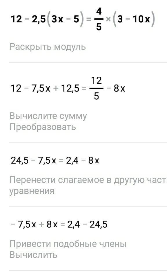 Уравнение имеет вид: 12-2,5·(3Х-5)=4/5·(3-10Х)