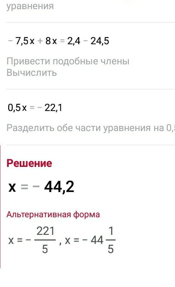 Отсюда Х=-221/5= - 44,2 или в виде дроби -44(1/5)