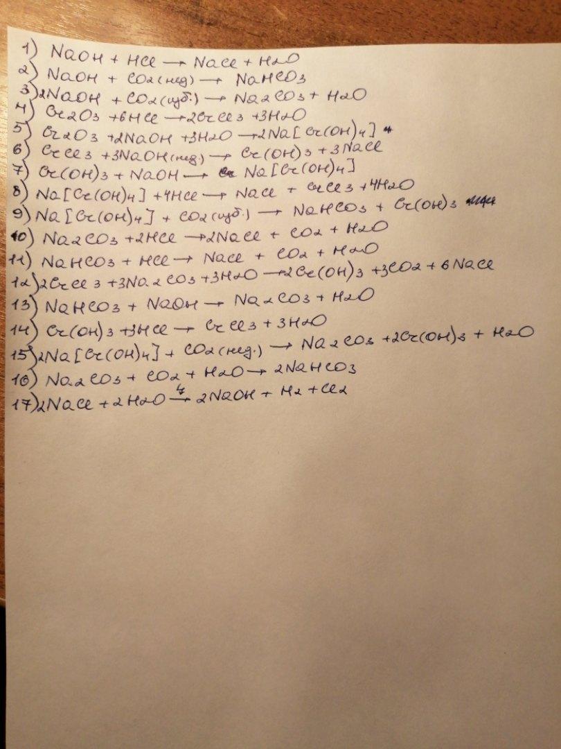 Даны четыре вещества: водный раствор гидроксида натрия, соляная кислота, углекислый газ и оксид хрома (III). Напишите не менее пятнадцати уравнений реакций с участием данных веществ, а также с участием продуктов их взаимодействия.