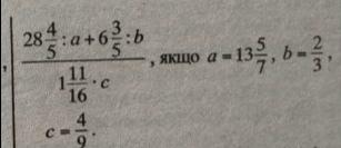 displaystyle [frac{{28frac{4}{5}:a+6frac{3}{5}:b}}{{1frac{{11}}{{16}} cdot c}}=frac{{28frac{4}{5}:13frac{5}{7}+6frac{3}{5}:frac{2}{3}}}{{1frac{{11}}{{16}}cdot frac{4}{9}}}=frac{{frac{{144}}{5}:frac{{96}}{7}+frac{{33}}{5}:frac{2}{3}}}{{frac{{27}}{{16}} cdot frac{4}{9}}}=]