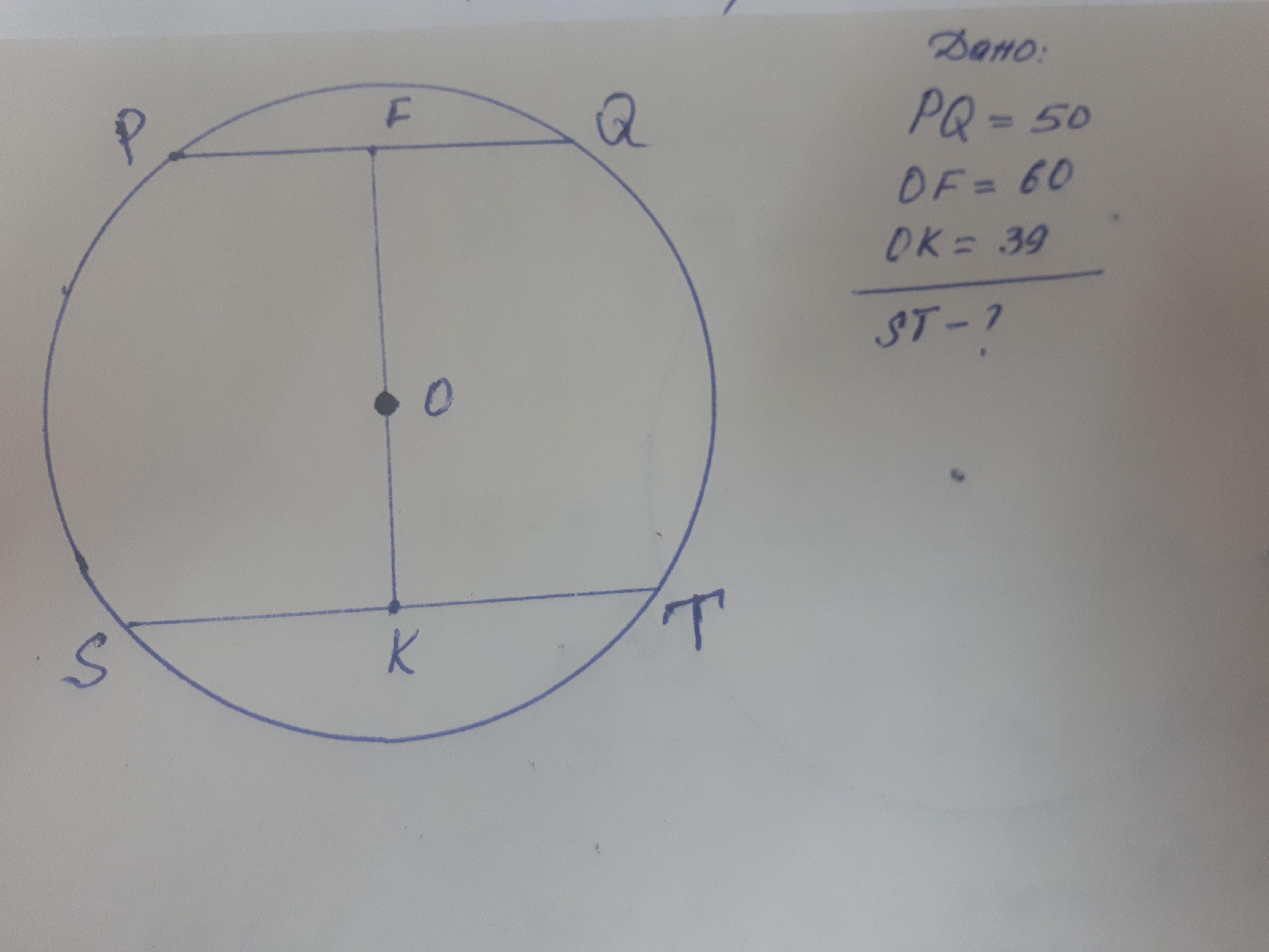 24) Отрезки PQ и ST являются хордами окружности . Найдите длину хорды ST, если PQ=50 , а расстояния от центра окружности до хорд PQ и ST равны соотвественно 60 и 39 ( нарисуйте рисунок)