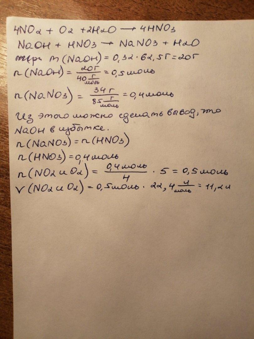 Смесь бурого газа и кислорода растворили в воде. К раствору прилили 62,5 г 32%-го раствора гидроксида натрия, которая полностью нейтрализовала кислоту. При этом выделилось 34 г соли. Определите объем газов, которые были использованы в реакции. В ответе запишите уравнения реакций, которые указаны в условии задачи, и приведите все необходимые вычисления (указывайте единицы измерения искомых физических величин).