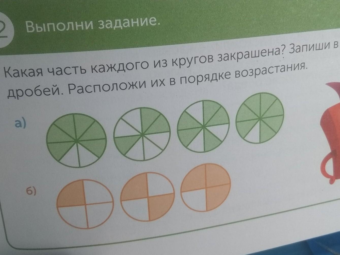 Какая часть каждого из кругов закрашена? Запиши в виде дробей. Расположи их в порядке возрастания
