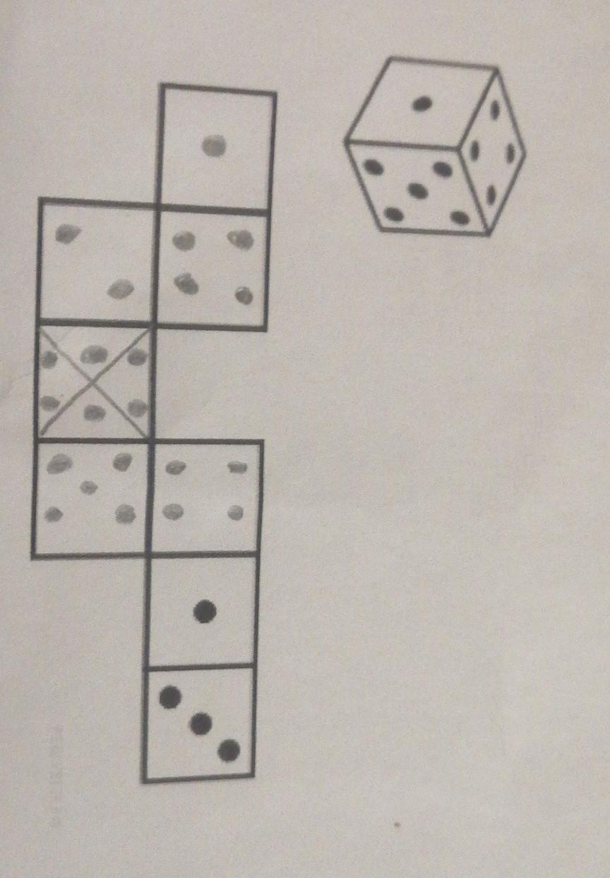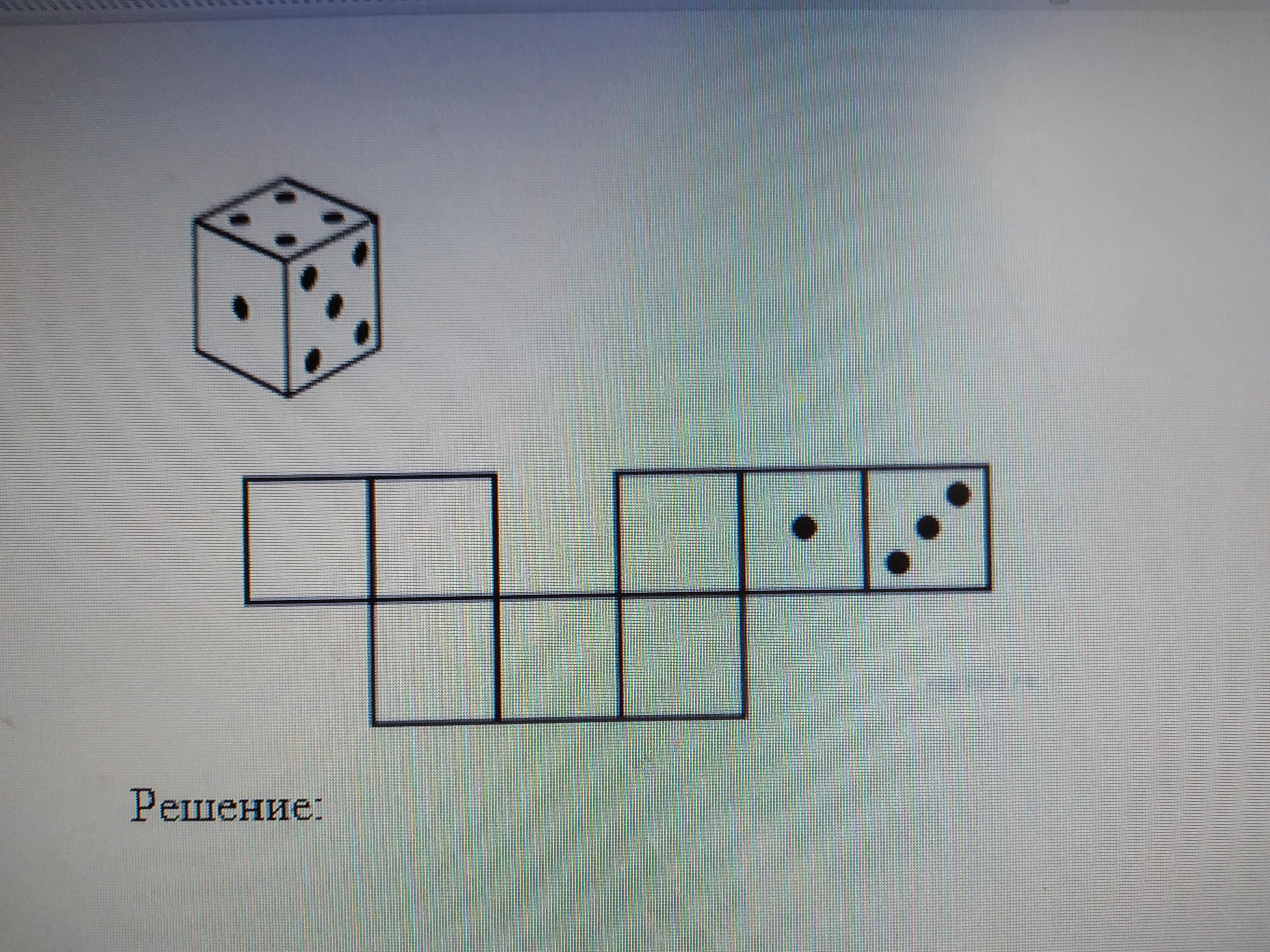 Игральный кубик прокатили по столу. На рисунке изображён след кубика. Отметьте на рисунке место, в котором грань с шестью точками соприкасалась со столом. Считайте что сумма чисел на противоположных сторонах кубика равна 7