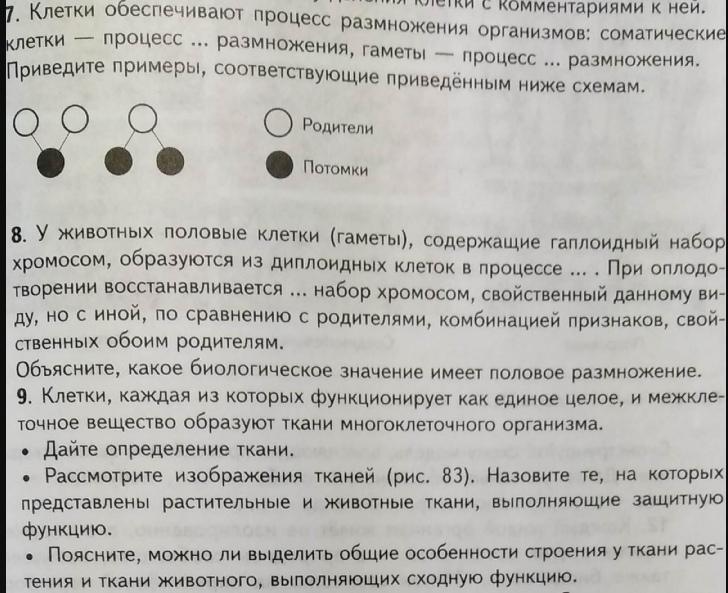 Ответ: 7)бесполого , полового. 8)мейоза, диплоидный. 9)ткань - это группа клеток и межклеточное вещество, сходных по строению, выполняемым функциям, имеющих общее происхождение. У растений защитную функцию выполняет покровная ткань, а у животных соединительная и эпителиальная