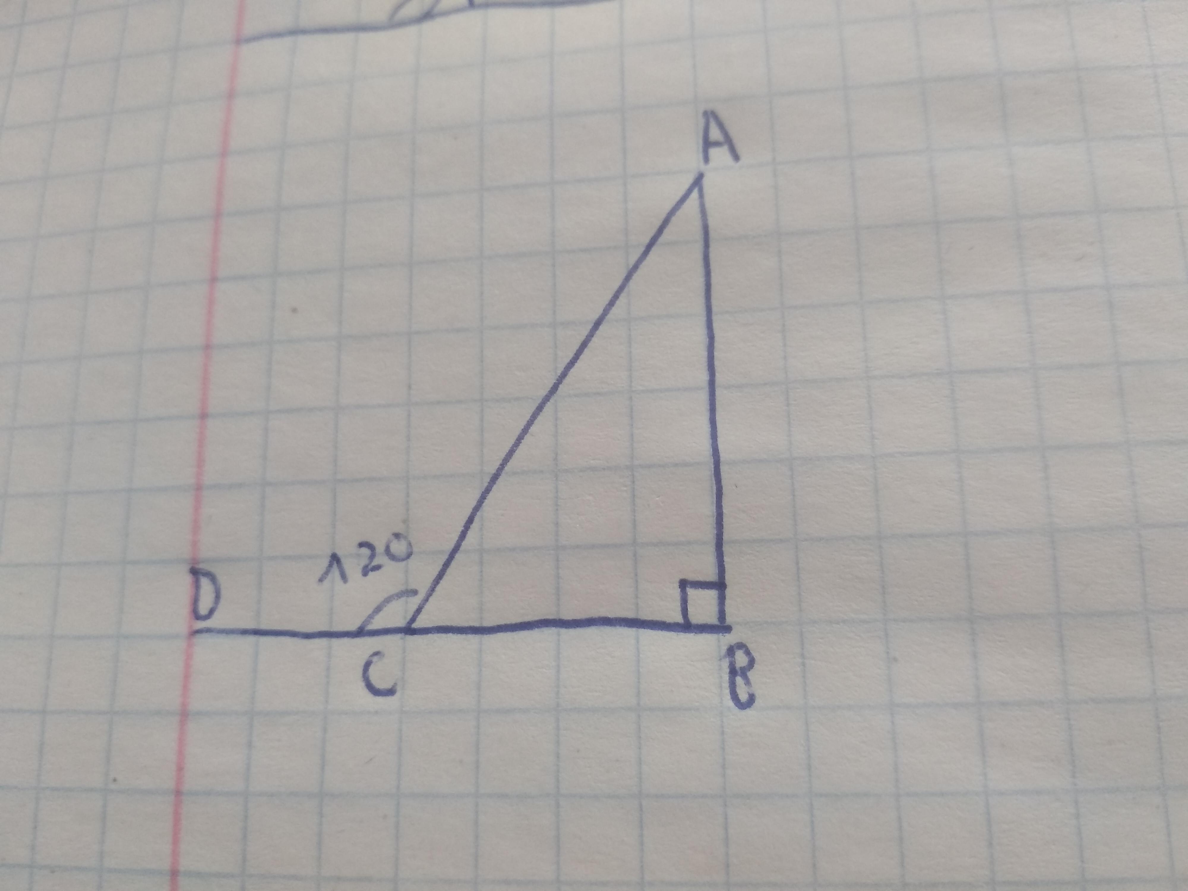 Нарисуем снова прямоугольный треугольник ABC и нарисуем внешний угол к углу a, обозначим его, как BAD. По условию угол BAD=120°,а так как внешний угол- это угол, смежный с каким-нибудь углом в треугольнике, то угол A=60°,из теоремы суммы углов, угол C=180-90-60=30