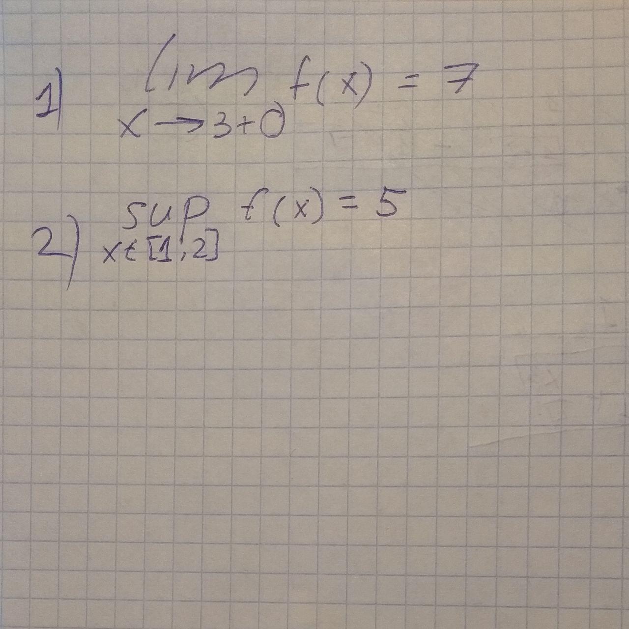 2) Буквами sup обозначается точная верхняя граница некоторого множества. В данном случае таким множеством является множество значений функции f(x) из интервала x∈[1;2]. Это значит, что либо наибольшее значение функции f(x) на этом интервале равно 5, либо значения этой функции в одной или нескольких точках данного интервала неограниченного приближаются к числу 5, то есть предел функции f(x) в этой точке (в этих точках) равен 5. Обобщая, можно сказать так: запись sup f(x)=5 при x∈[1;2] означает, что предел функции f(x) в одной, нескольких или даже во всех точках интервала x∈[1;2] равен 5.