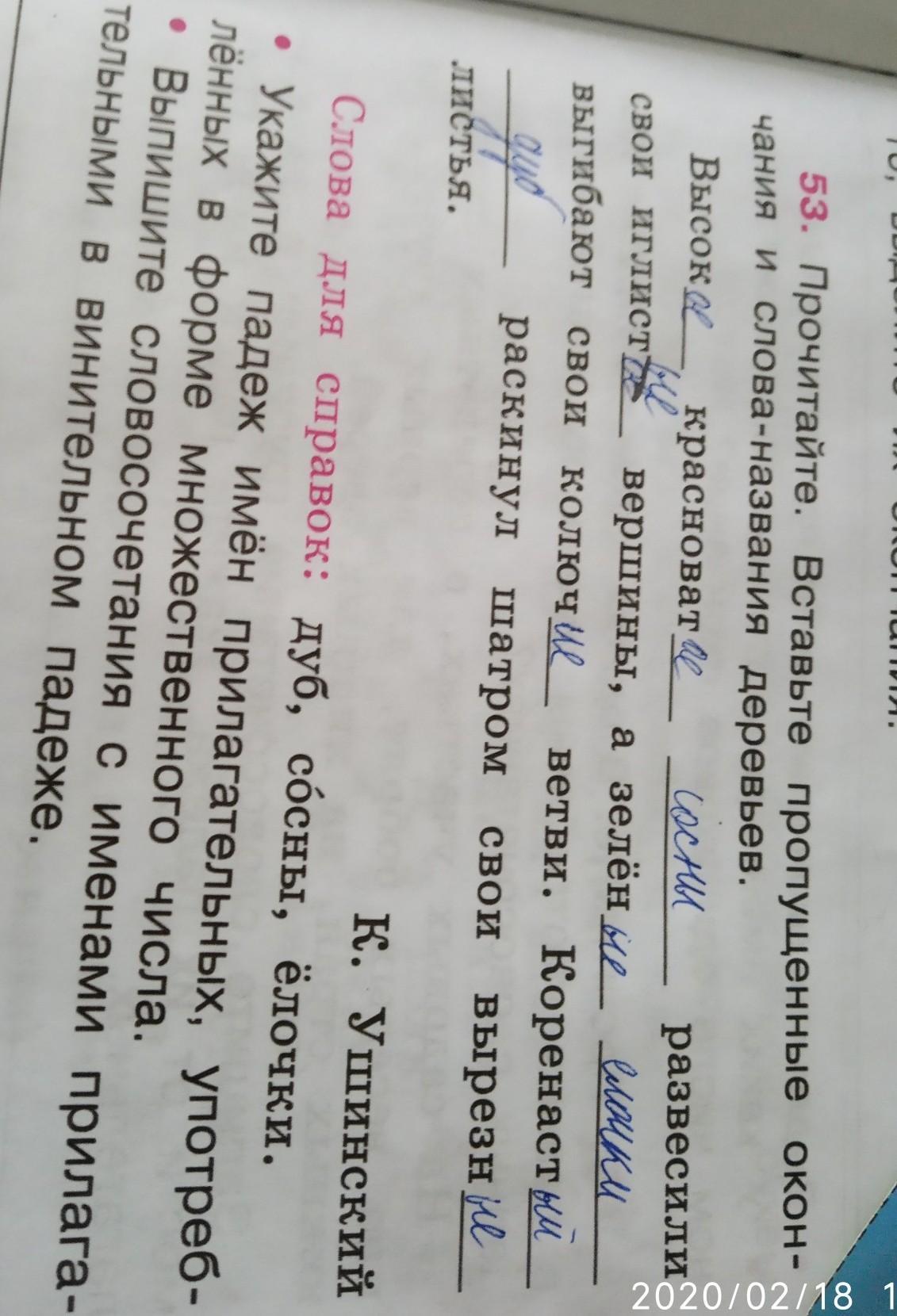 53. Высокие красноватые сóсны развесили свои иглистые вершины, а зелёные ёлочки выгибают свои колючие ветви. Коренастый дуб раскинул шатром свои вырезные листья.
