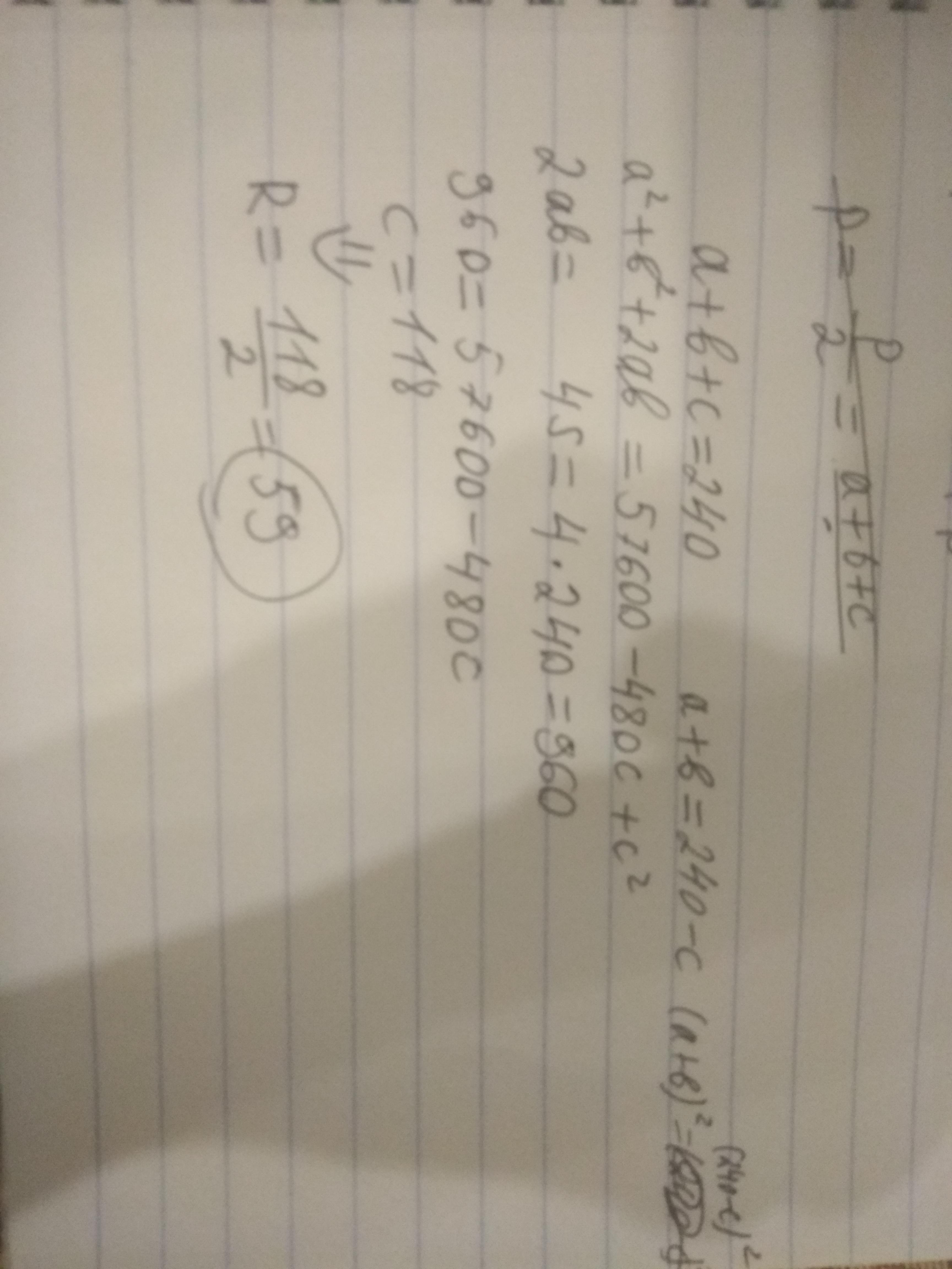 Периметр прямоугольного треугольника равен 240 см. Радиус вписанной окружности равен 20 см.