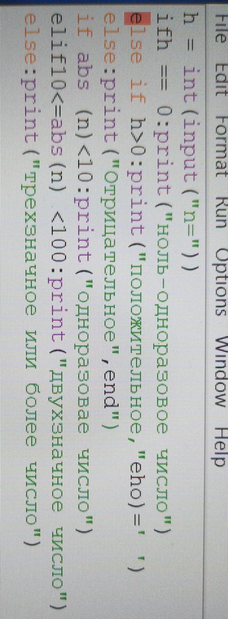 Ты знаешь, что такое пробелы? Много где после оператора if/elif/else у тебя сразу идёт имя переменной, ясен пень что интерпретатор понимает это не как кейворд и переменную, а просто как какое то имя, непонятно кому принадлежащее, и которое, логично, не объявленное ранее, и выдаёт ошибку. На строках 2, 3 - полнейший бардак внутри print(). Что ты пытался объяснить выражением "положительное, "eho)= ' '), или "отрицательное", end") - мягко сказать, не до конца понятно.