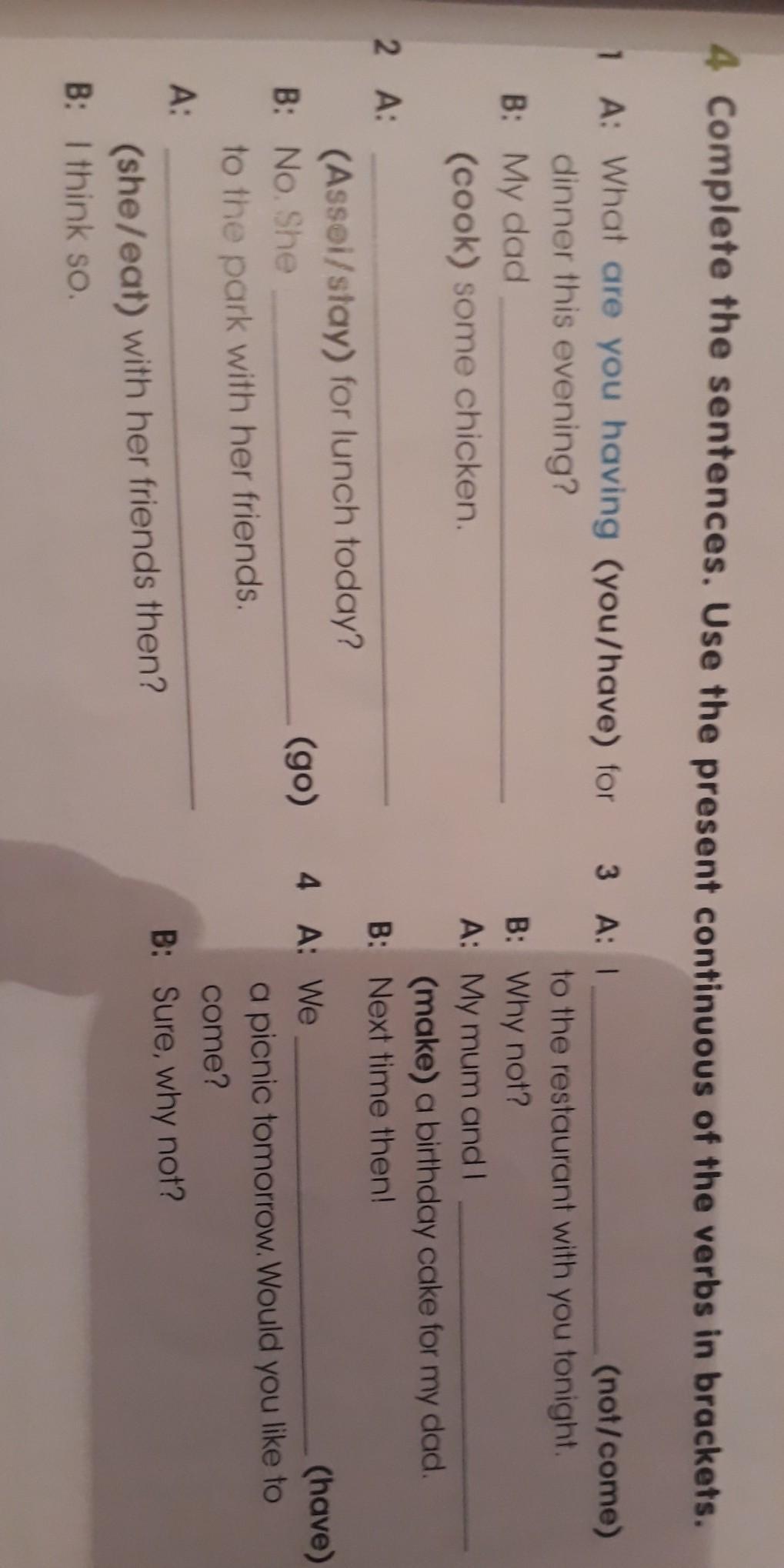 Ответ:1.my dad is cooking...2.Is Assei staing...she is going...3.is she eating...4.I am not coming...5. my mum and I are making...6. we are having...