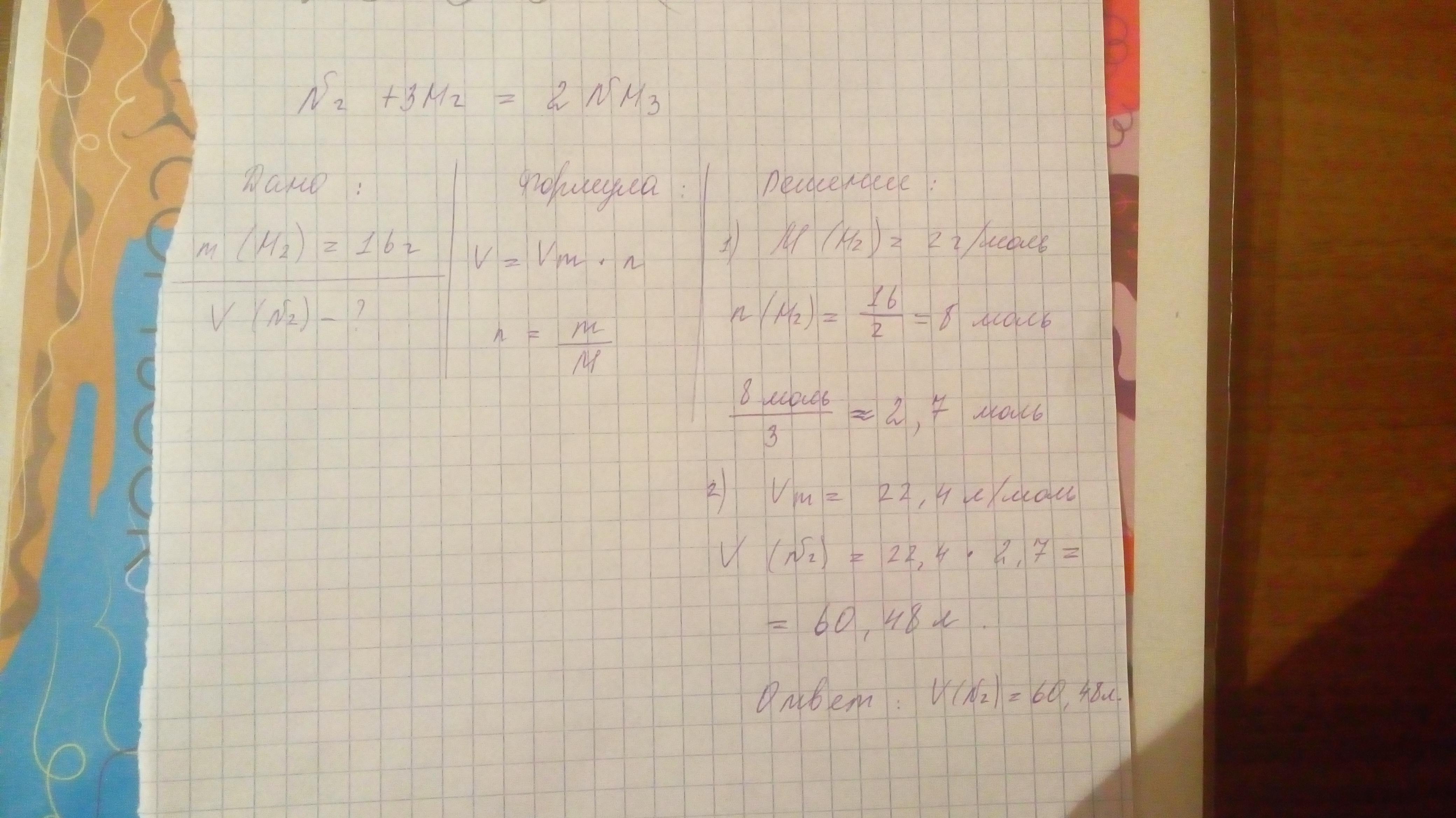 у: 16г водорода вступают в реакцию с азотом с образованием аммиака. найти объем азота, вступившего в реакцию