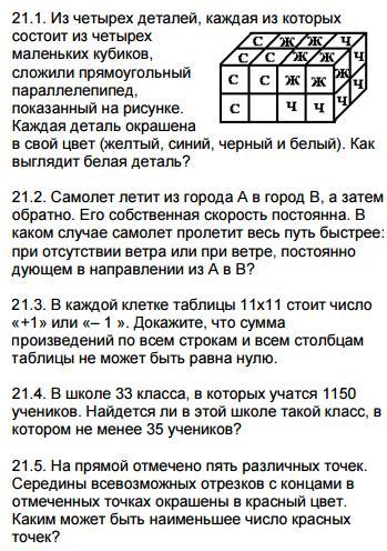 Самолет летит из города А в город В, а затем обратно. Его собственная скорость постоянна. В каком случае самолет пролетит весь путь быстрее: при отсутствии ветра или при ветре, постоянно дующем в направлении из А в В? 21.3. В каждой клетке таблицы 11х11 стоит число «+1» или «– 1 ». Докажите, что сумма произведений по всем строкам и всем столбцам таблицы не может быть равна нулю.