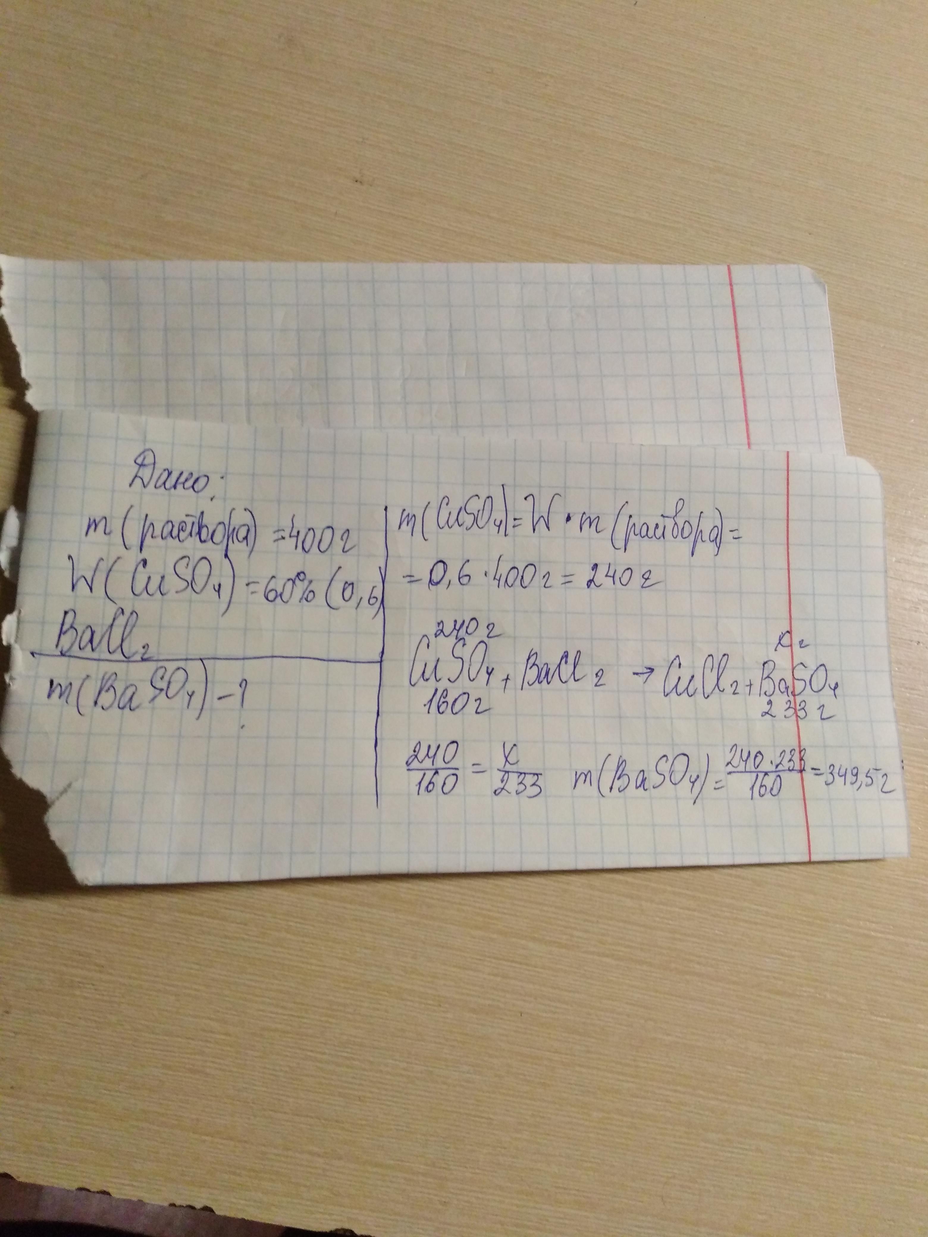 Вычислите массу осадка сульфата бария BaSO4, который образуется при взаимодействии хлорида Бария (II) с 400г 60% раствора сульфата меди (II).