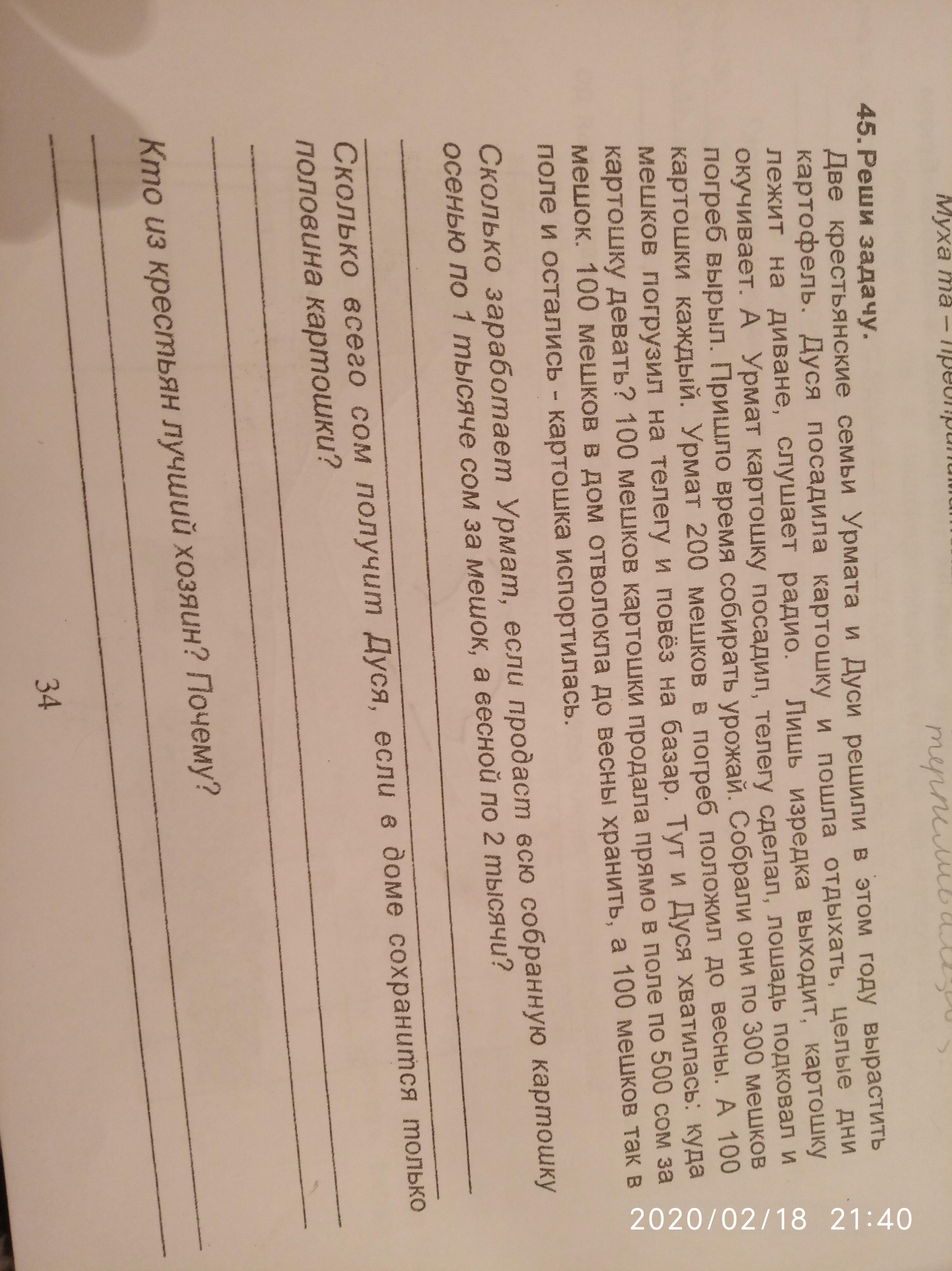 2) У Дуси 100 мешков дома, сохранилось к весне только 50, следовательно заработок будет 100 тысяч сом