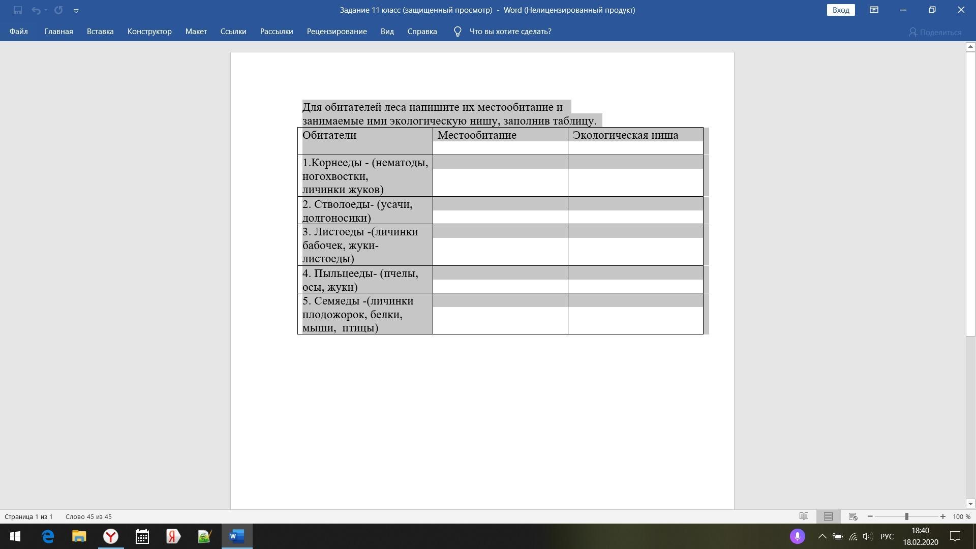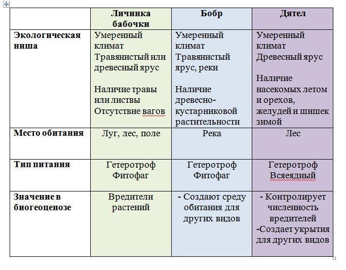 Для обитателей леса напишите их местообитание и занимаемые ими экологическую нишу, заполнив таблицу. Обитатели Местообитание Экологическая ниша 1.Корнееды - (нематоды, ногохвостки, личинки жуков) 2. Стволоеды- (усачи, долгоносики) 3. Листоеды -(личинки бабочек, жуки- листоеды) 4. Пыльцееды- (пчелы, осы, жуки) 5. Семяеды -(личинки плодожорок, белки, мыши, птицы)