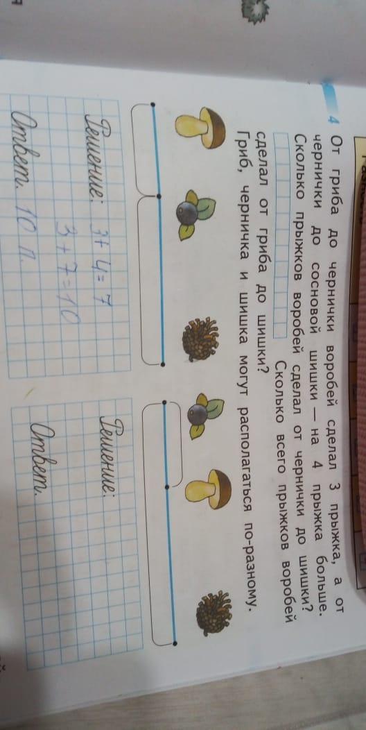 Ответ: от гриба до черники 3 пр. , всего мы уже знаем расстояние 10 прыжков . Значит сначала воробей двигался к чернике , это уже 3 пр. , потом он начал двигаться в сторону шишки это ещё 10 прыжков . значит: