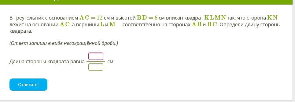 В треугольник с основанием AC= 12 см и высотой BD= 6 см вписан квадрат KLMN так, что сторона KN лежит на основании AC , а вершины L и M — соответственно на сторонах AB и BC . Определи длину стороны квадрата.