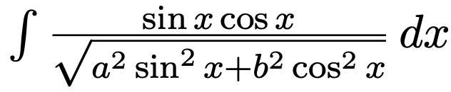 a^2sin^2x+b^2cos^2x=t=>dt=2sinxcosxa^2-2sinxcosxb^2=sincosx(2a^2-2b^2)dx\ int dfrac{dt}{(2a^2-2b^2)sqrt t}=dfrac{1}{2a^2-2b^2}2sqrt t+C=dfrac{sqrt {a^2sin^2x+b^2cos^2x}}{a^2-b^2}+C